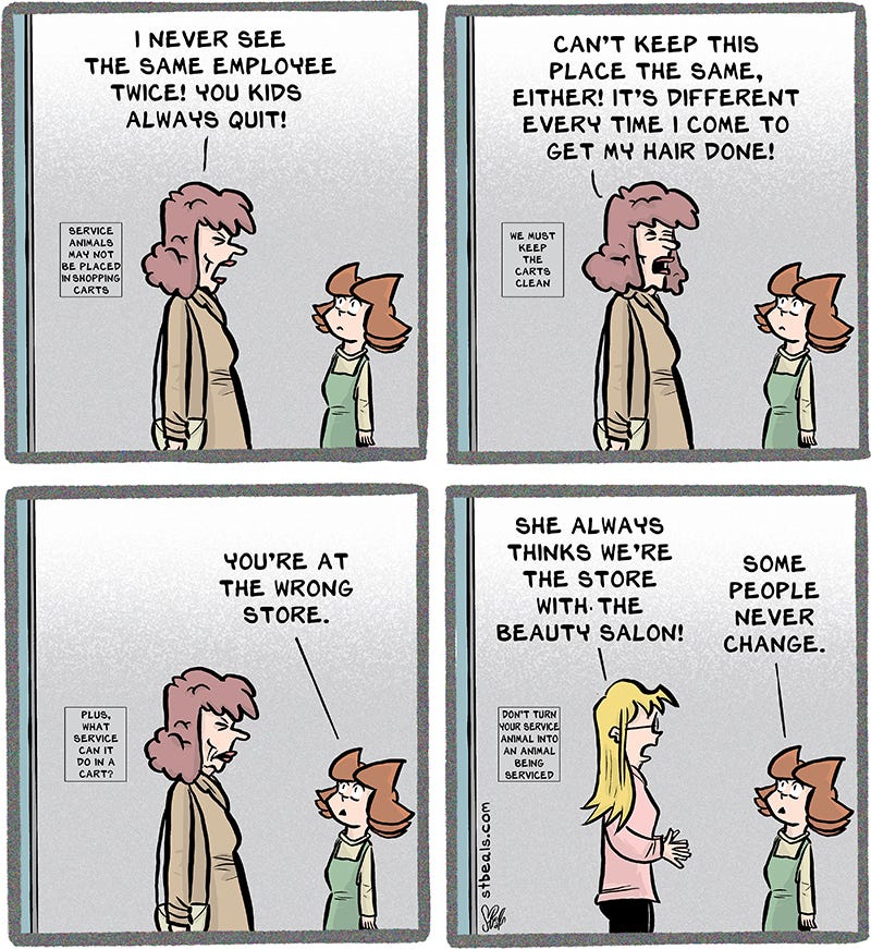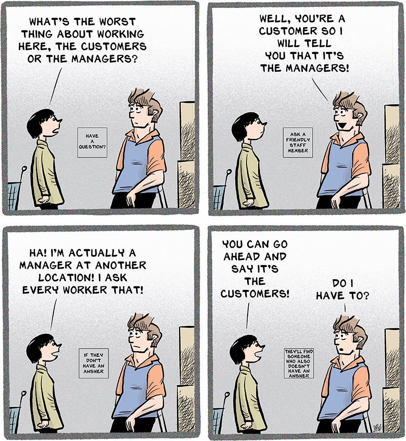 In reality, the cashier tells her manager who responds back to the cashier that she just needs to tell the customer thank you and move on. It’s not a game of advancing helpful information, it’s a game of ping-pong.