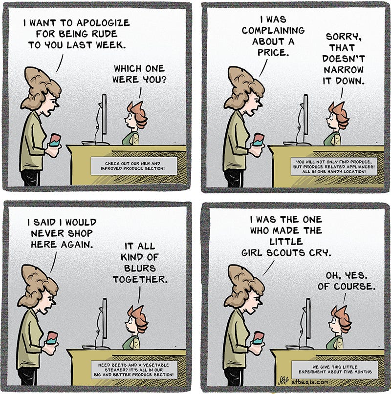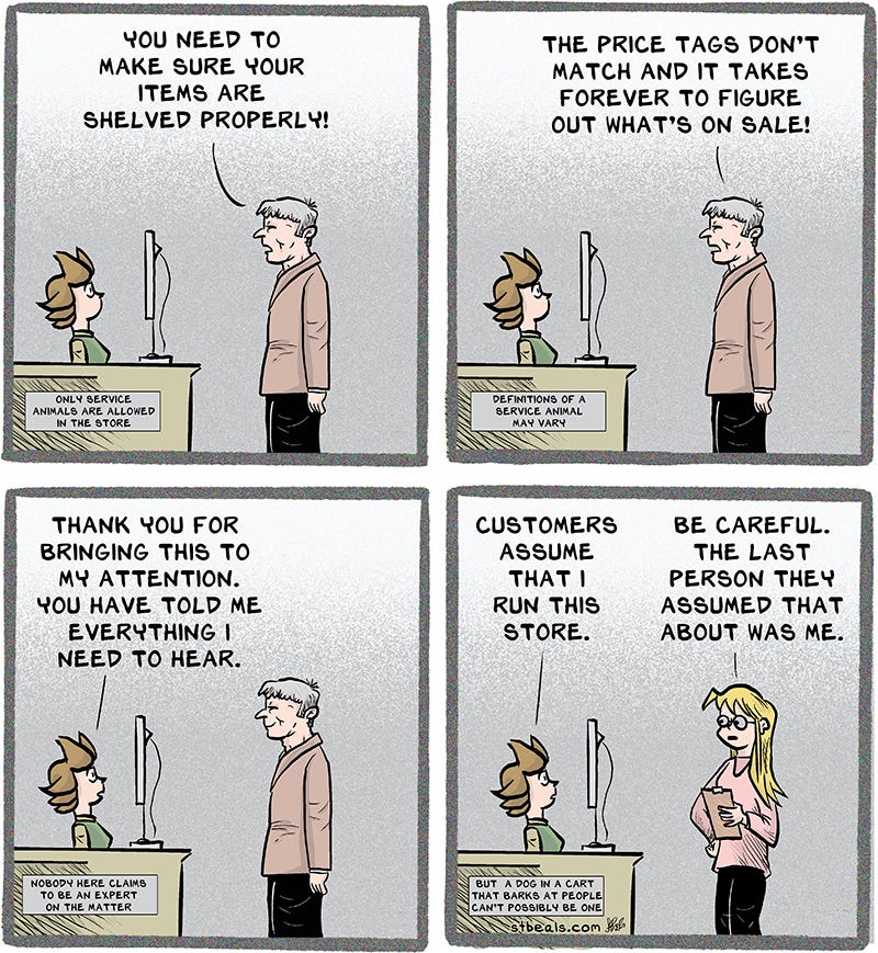 I’m always fascinated by customers who give detailed instructions on how to improve the store to a cashier. Unless the cashier is the owner or the owner’s daughter, it’s really not going very far. In fact, even if the cashier is the owner’s daughter it may not go very far. One reader commented that the usual expectation is that the cashier will tell her manager, who will tell her manager, until, I can only assume, the feedback is presented with helpful charts and graphs to a board of directors.