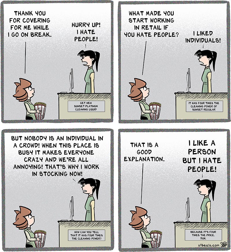 Vickie is not wrong, here. When confronted with a crowd of people, try breaking them up into individuals so that you will like them. The best way to do this is to stand behind a service counter.
