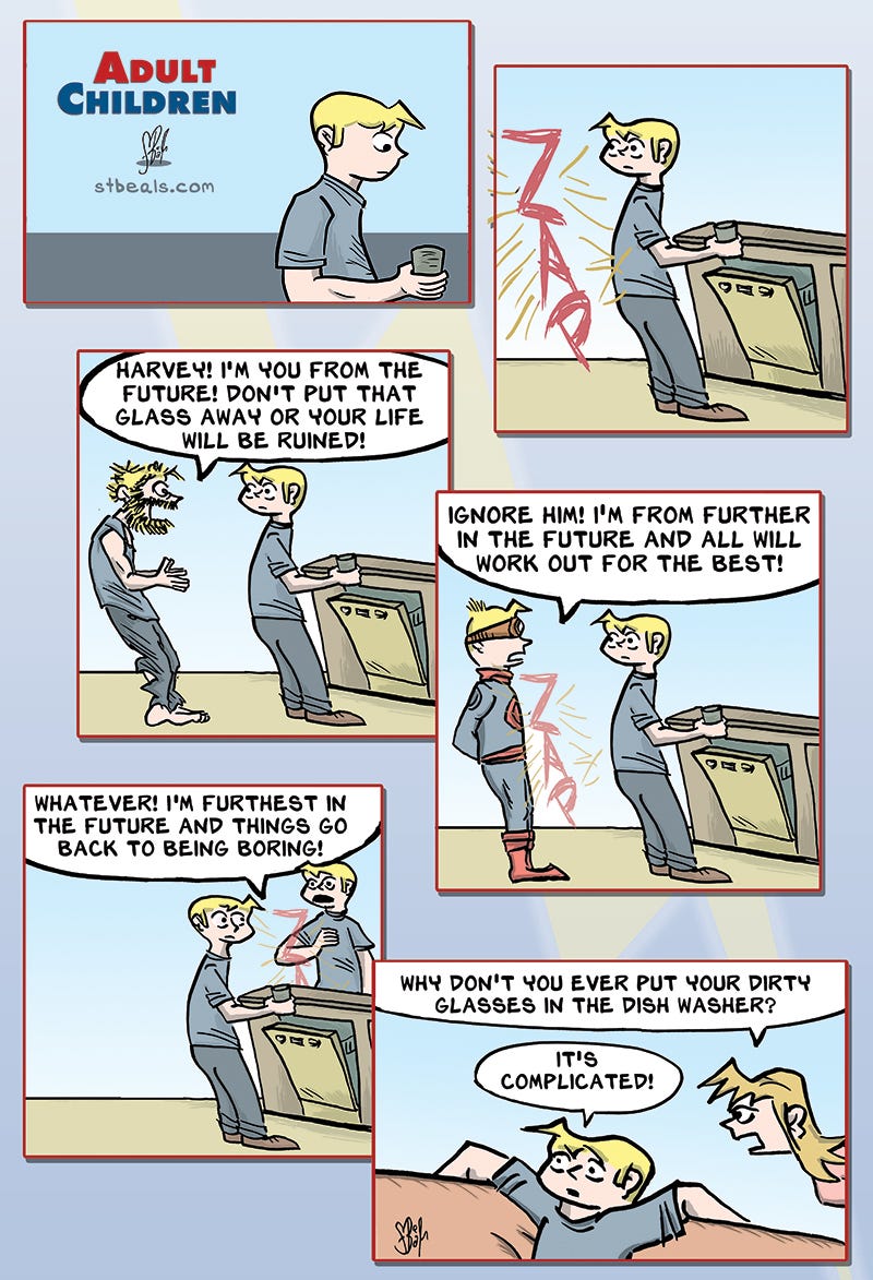 I purposely started my comic without a theme. My reasoning was that I had tried many themes in the past and I wanted to do a comic that was just for me. Some people watch TV after work, some exercise, some read, and some unwind by making a goofy comic to entertain themselves (but that’s a mighty few “some”).