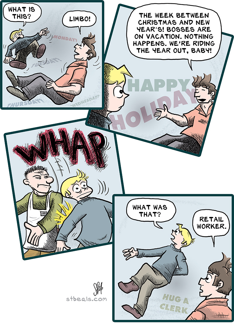 If you’ve worked in an office between the two major holidays, it’s pretty surreal. Nothing is done. Nothing is expected to be done. You’re just there. I once worked in a library acquisitions department where we sat around like it was our house.