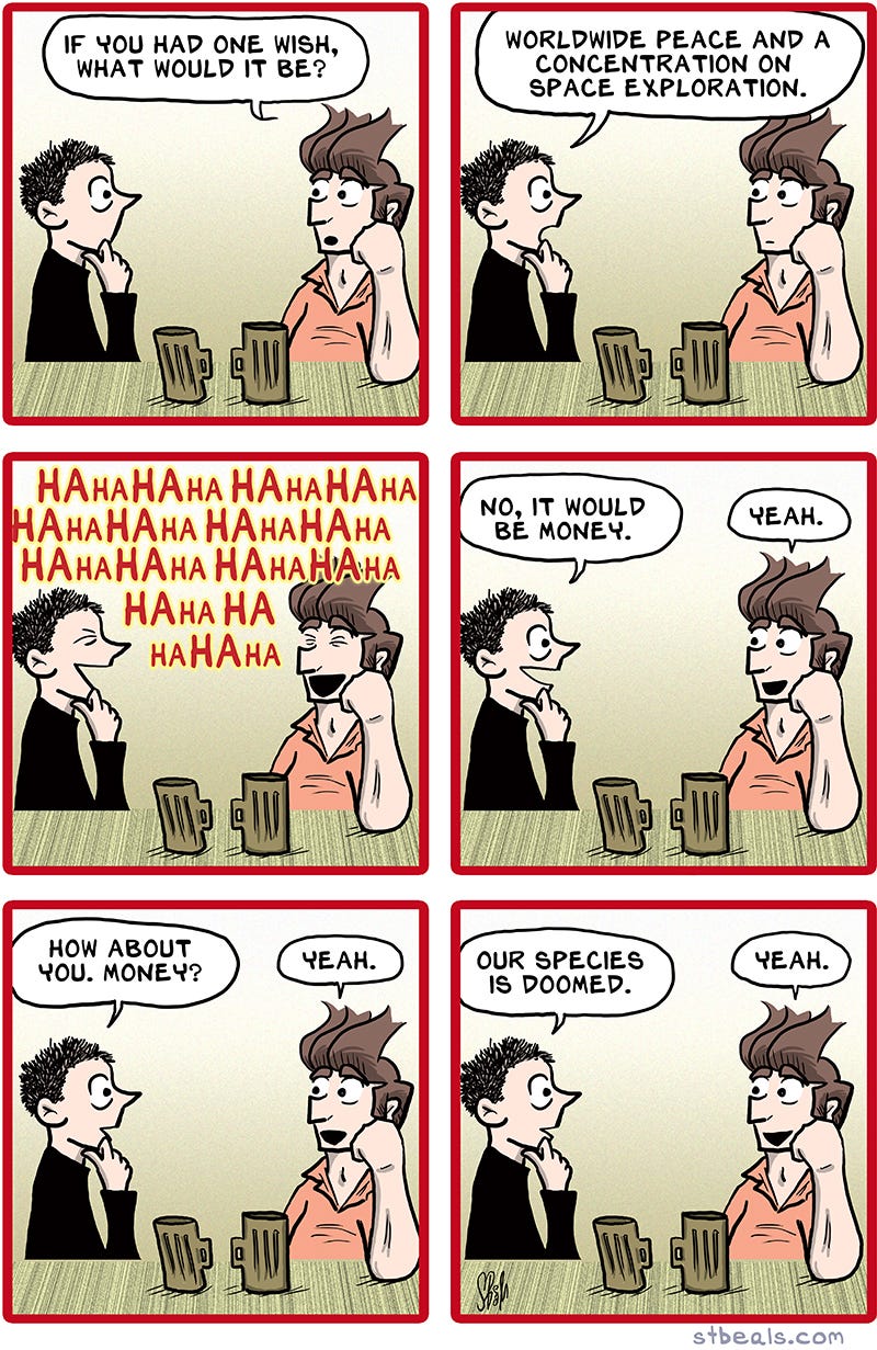 Ok, sure, this is a bit dark. But I still contend that if I was given a wish that could potentially change the world, it would be extremely hard not to be selfish. Which is why I would just become Superman. Yes, I would be saving the world with my Superman powers, but I would also selfishly give myself the powers of Superman. Win-win.