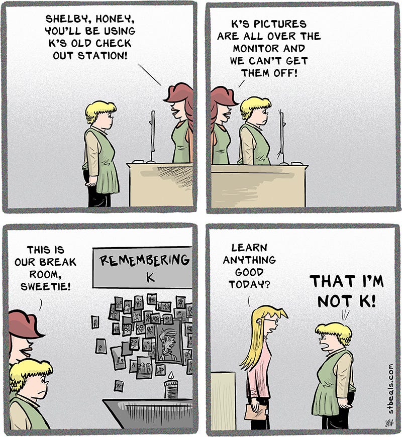 Here I examine the grief that is still going through the staff about the person who’s just left. In this case it’s K.