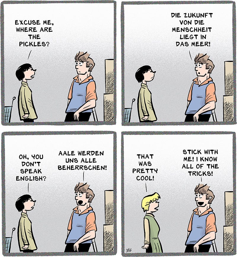 I like the idea of Berle sticking stuff into Translate and memorising the output. Commitment to the bit!