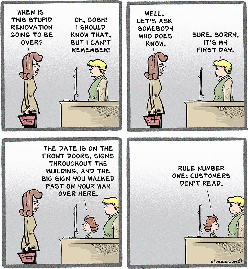 I’ve been a new employee many times since BSTICCALOL, and if I’ve learned anything it’s to sincerely fake enthusiasm. Bitterness needs to be earned. Save your disgust until you’ve worked there awhile or you’ll look like a dork. Once you’ve passed your probationary period, spread your whining wings and fly.