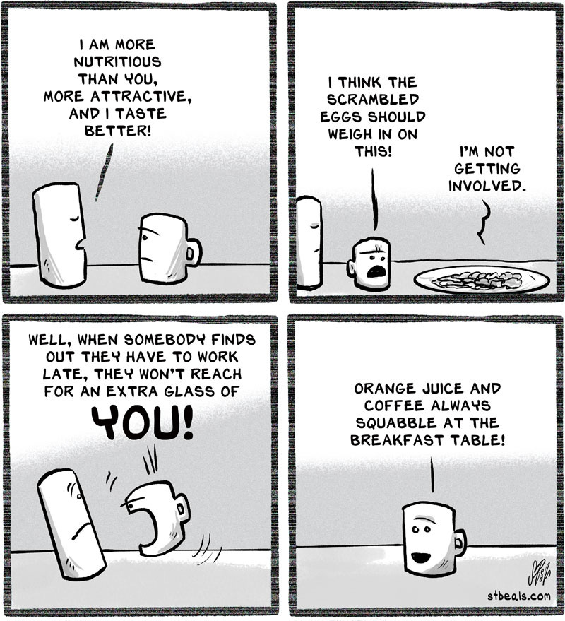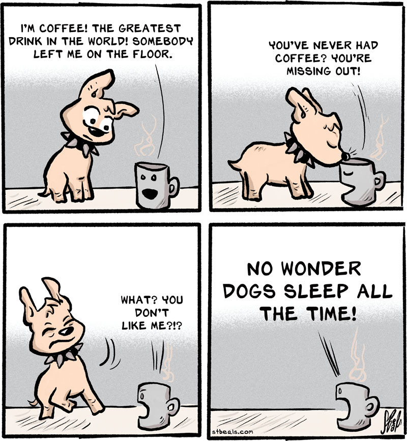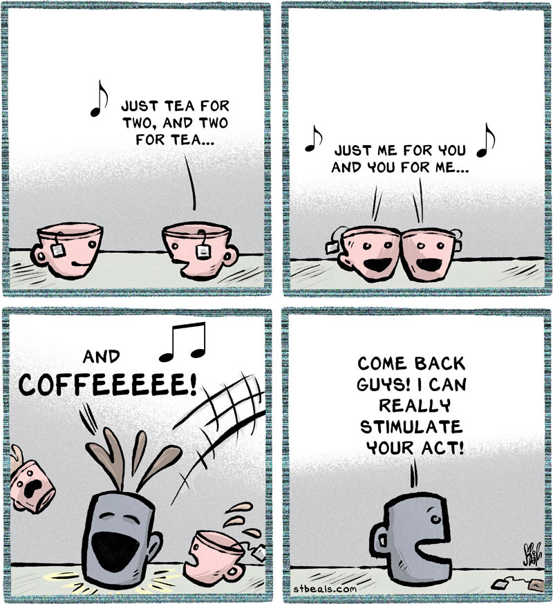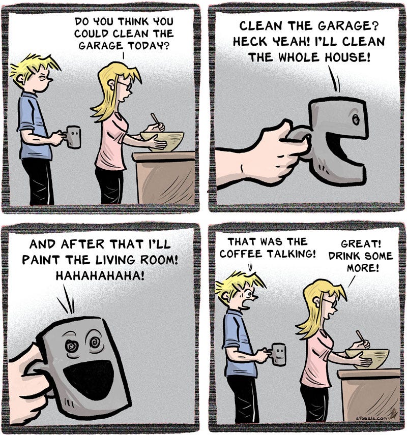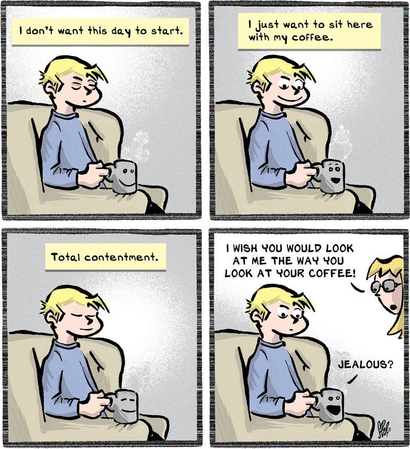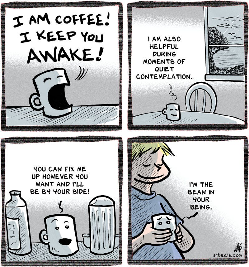 Despite my characterization in the comic, coffee is loud without producing noise. That’s really the key to the whole relationship. If you need someone who’s cheerful and stimulating without making a concentration-shattering sound, you need coffee.