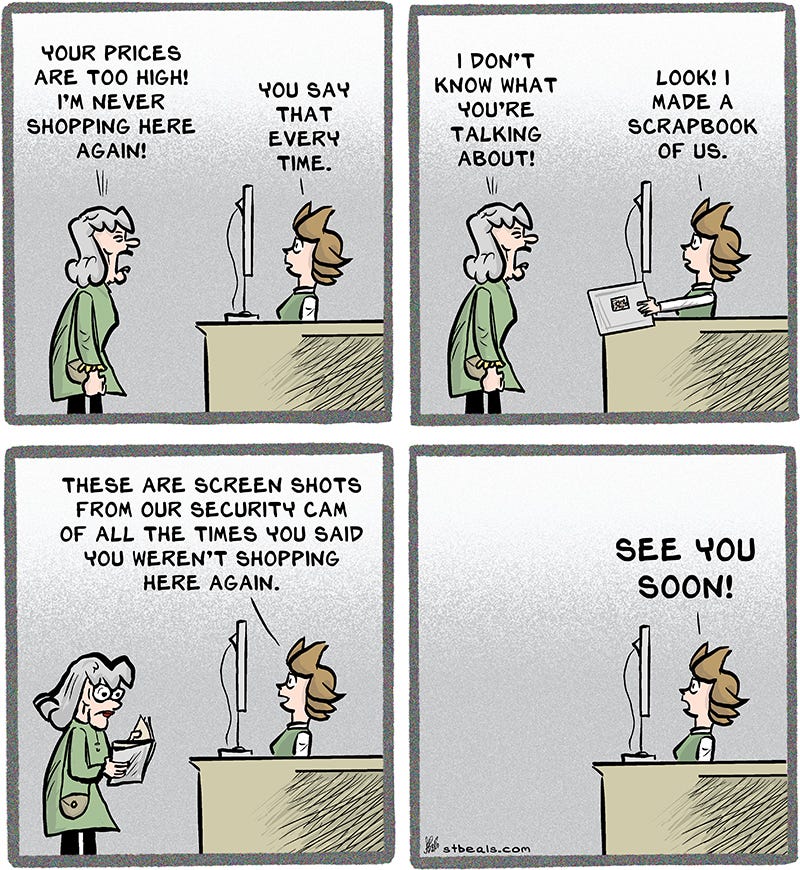Yes, I’ve joked about this with people. So have you. So has everybody. The trick is to know when to make the joke. If the customer looks like they are on the verge of a medical emergency, it’s time to only wear your deep frown of concern. The goal is to add some spice to your day, not make it worse.