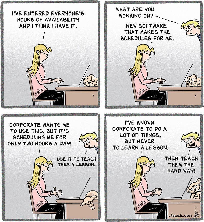 This was software that I had to use. It would helpfully fill in everyone’s schedule and then I would have to helpfully change all of the schedules. If you ever wonder why managers spend so much time in their office, it’s because corporate decided to be helpful.