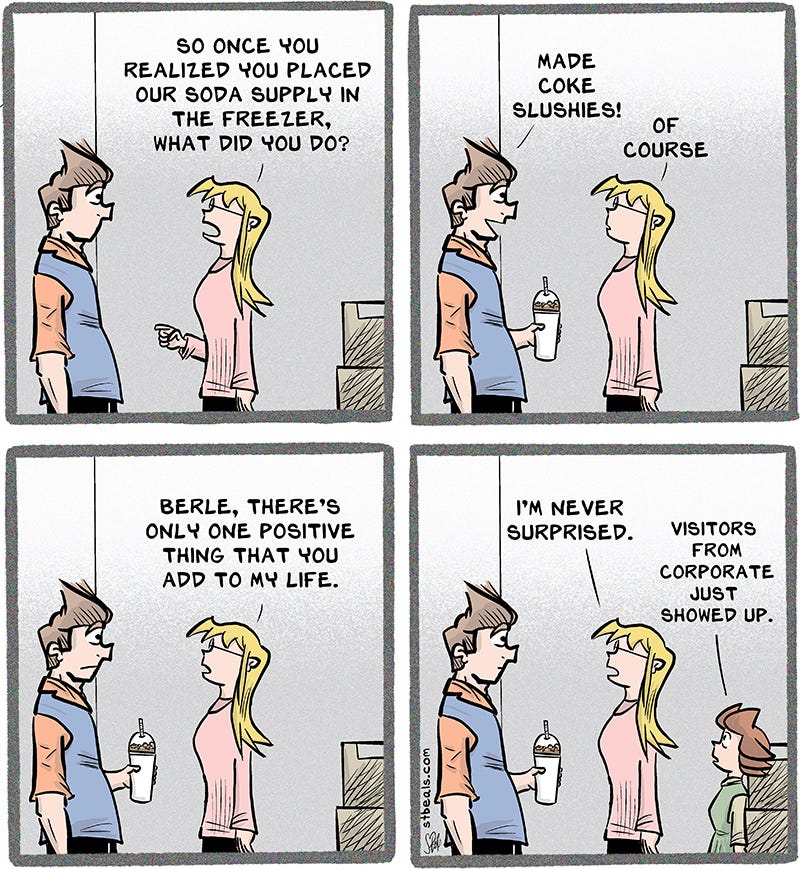 Loved the one about Berle making Coke slushies and corporate showing up for a visit! I don't remember ever seeing these strips. Maybe if there were a book collection of them, I could send you money and happily chortle away my days reading hilarious content from the past.