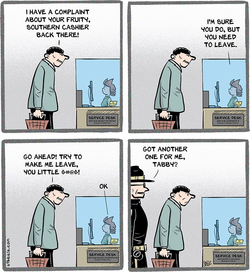 It hasn’t happened, of course. In real life, I delivered April Bloom’s final line to the frothing customer. Security might have also been involved. Customer service can go quite smoothly with sharp security personnel standing by.
