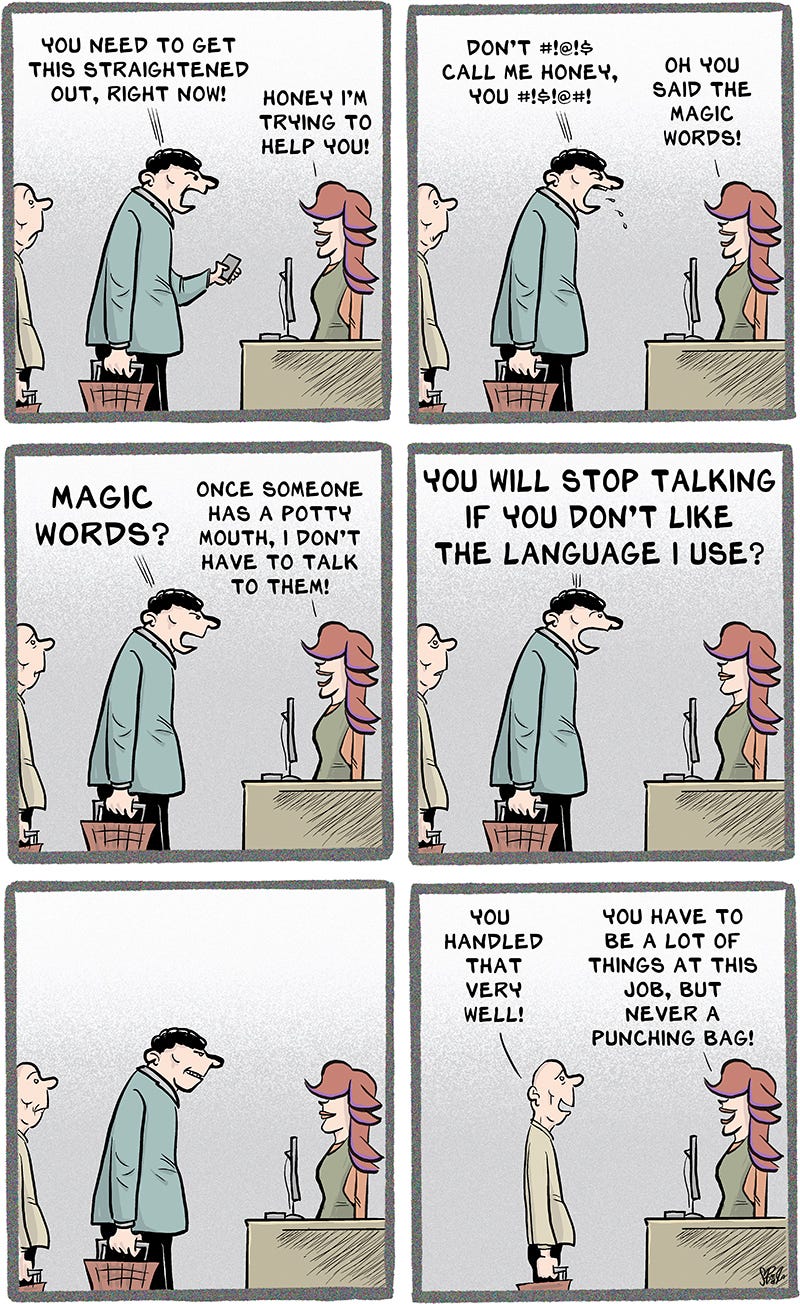 I’m in awe of workers who can remain bright and cheerful in the face of a frothing customer. I’ve seen them in action and have vowed to myself that some day I, too, will posses the same kind of Zen that will carry me through hostile conversations.