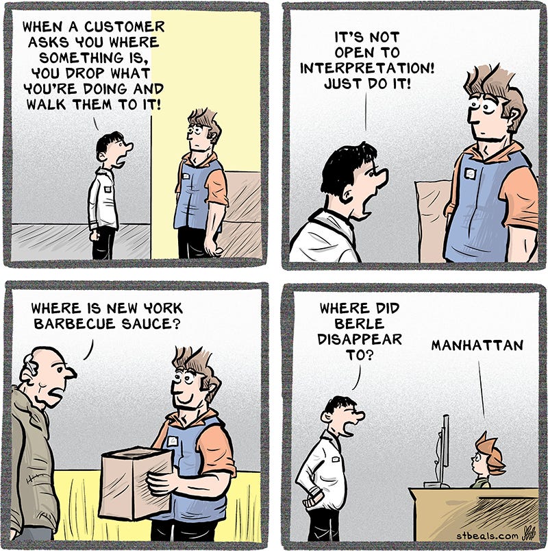 These were actual orders given to stocking staff members which made me instantly think of this scenario.