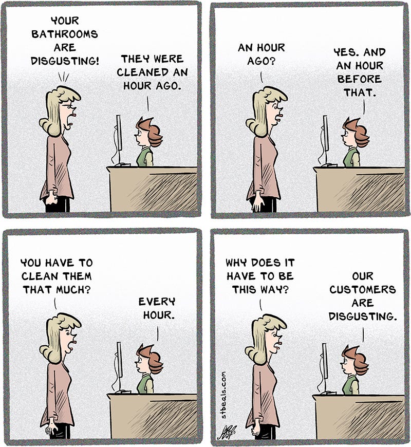 Customers are disgusting, and every time I need to go to the bathroom it’s closed for cleaning. I’m thankful, of course, that it’s cleaned as much as it is, because by the time I notice the bathroom is available it’s so filthy that it I wonder when the cleaning people are coming back.