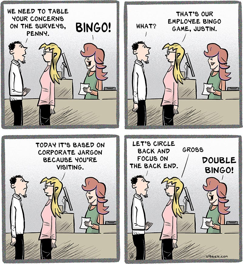 BINGO games exist for every job, but I haven’t seen one for corporate speak. If I hear “let’s circle back around” or “moving forward” at this stage in my life, I tend to run away screaming. It’s confusing to the person talking, but they need to “be aware” that they have successfully driven me crazy.