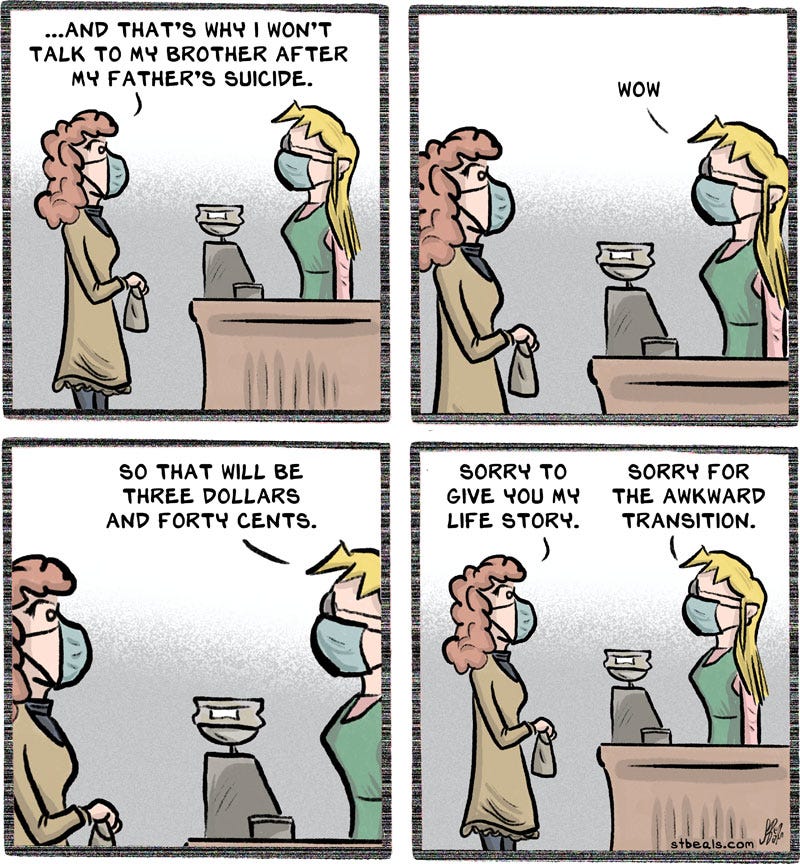 This happened a lot. People would open up to me. Being the welcoming listener that I am, I would put off the concluding statement as long as possible. But I had no transitional skills. I’m guessing that on this day a customer really did open up about something pretty serious and I delivered the consoling response that they had to pay money.