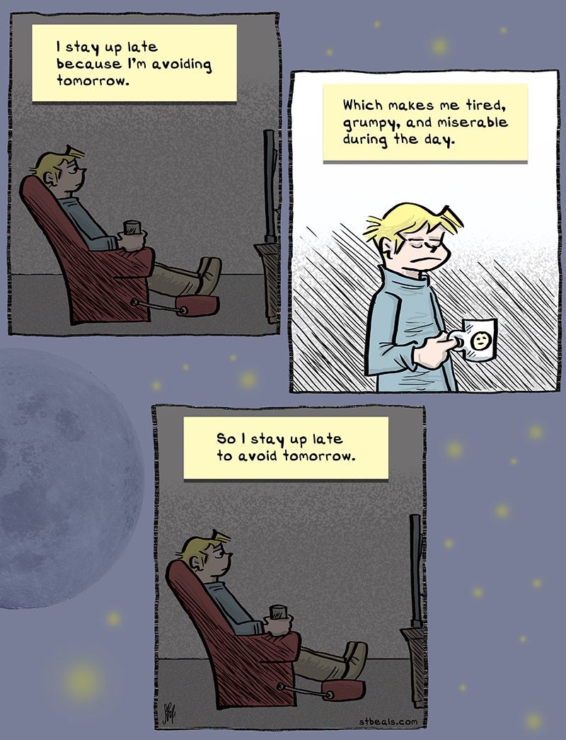 Here I am, typically having some insight about myself with no desire to change. Going to sleep means ending “me time”. Why would I want to do that?
