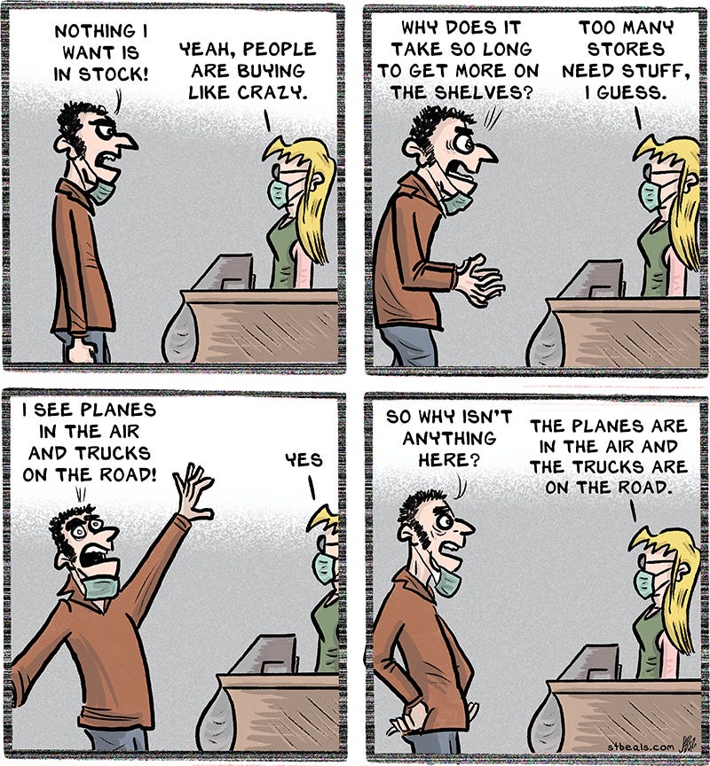 I mean, he asked me why stuff wasn’t here if we had planes in the air and trucks on the road. I gave him what I thought was the obvious answer. It’s still on the planes and trucks, dude.