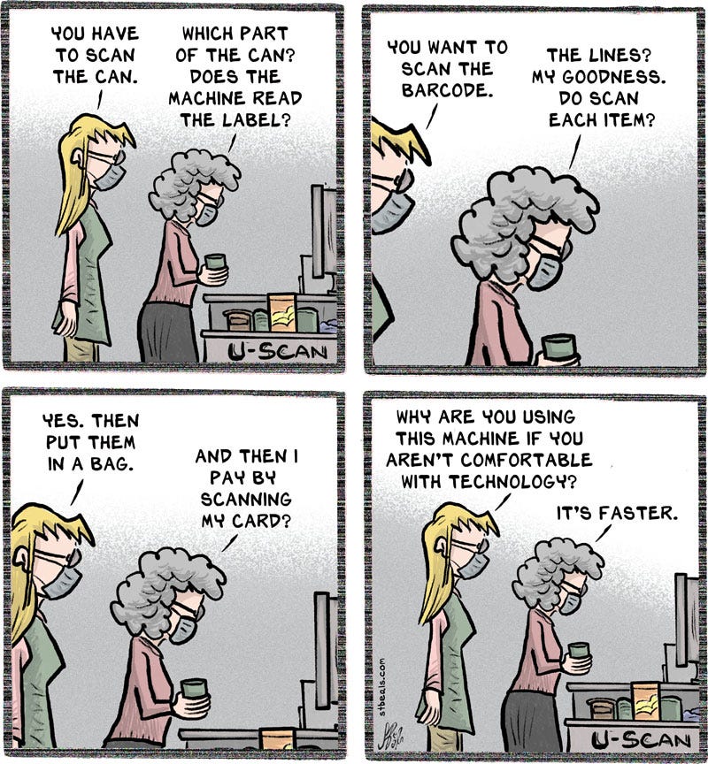 I was probably the customer behind this woman. On this day, I had to buy groceries and wondered, for the millionth time, why people who are clearly not comfortable with self checkout passed up the cashiers so they could do it themselves.
