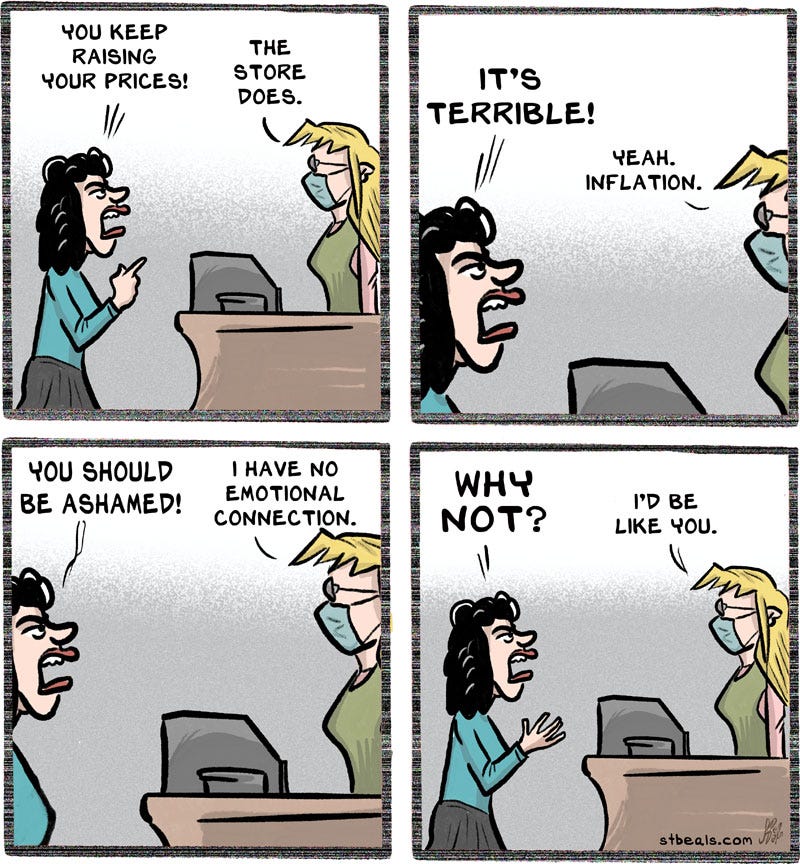 Yes, I’m upset about the prices. Why wouldn’t I be? But don’t yell at me while my emotions are shifted into neutral. Somebody’s getting rich off of the price hikes, lady, but it ain’t me.