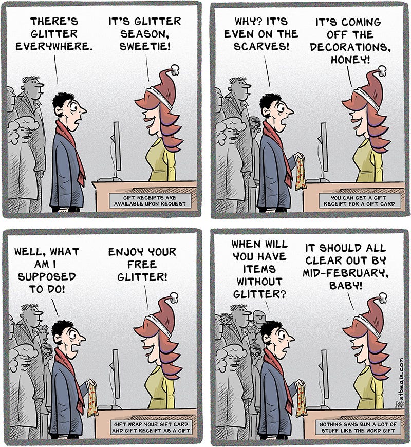 April Bloom, as usual, is being highly optimistic here. Glitter never goes away. It just hangs around until it’s in season again.