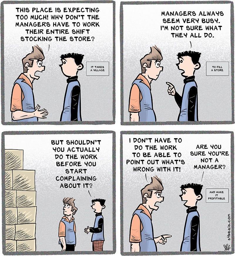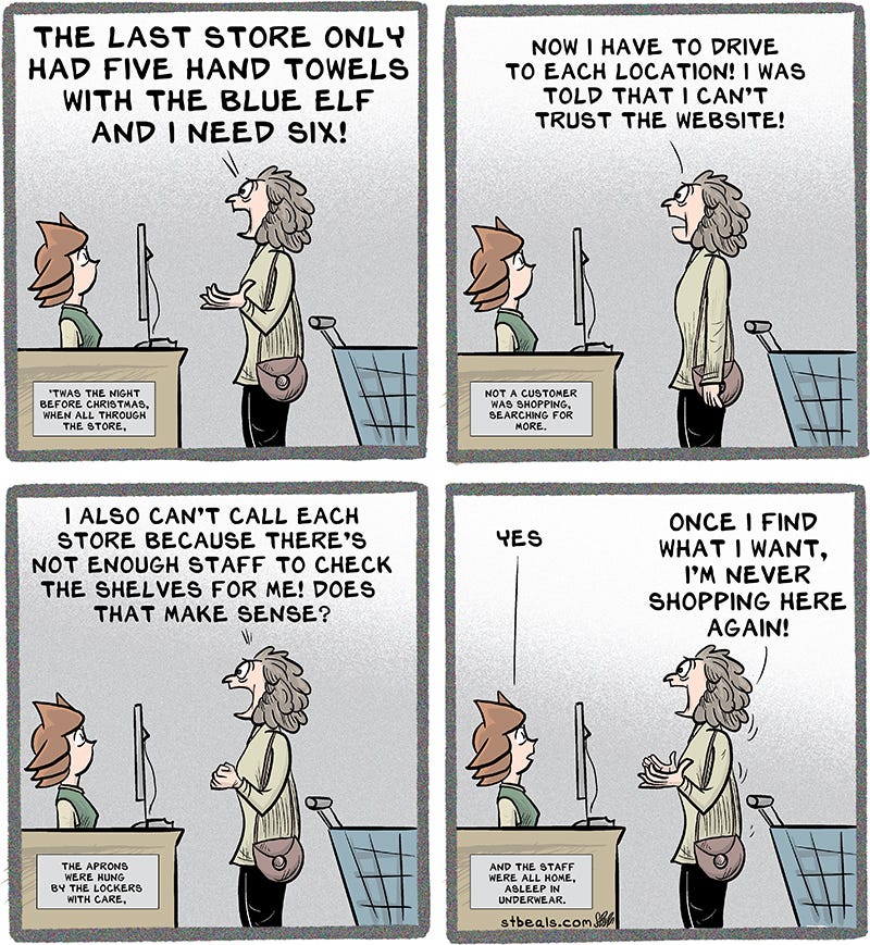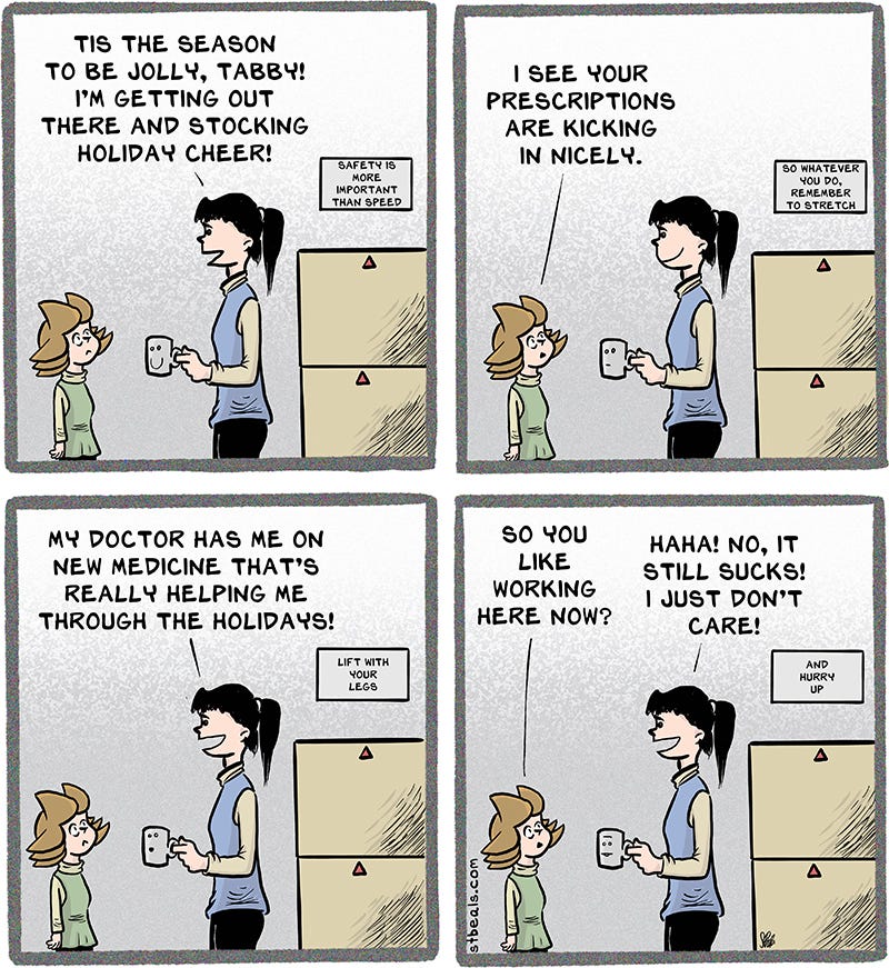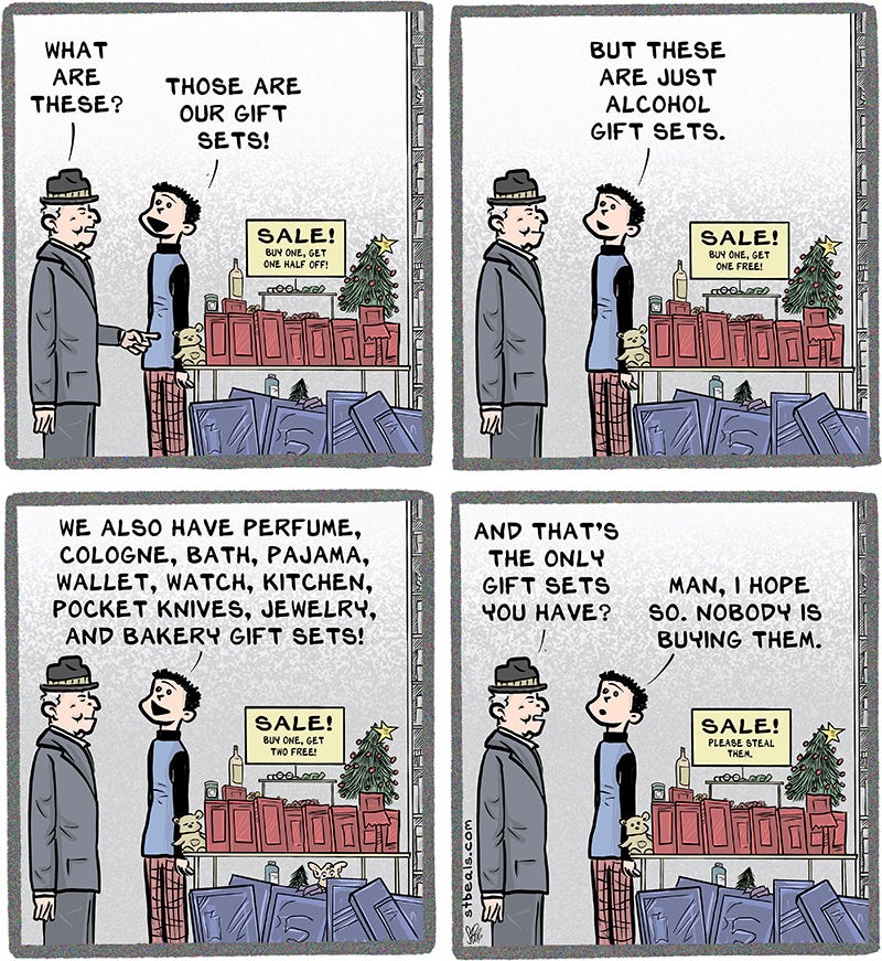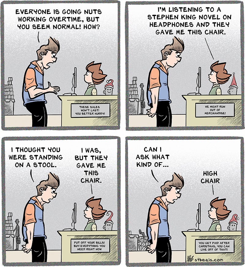 Now let’s all be merry and look at some recent comics about retail, a job which will work you to death during this merry time and make you absurd. Absurd is another word for loopy, but I wouldn’t think of using loopy around merry. I’ll wait until the guests are gone and I’m happy.