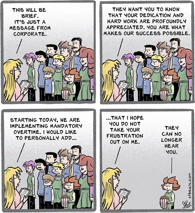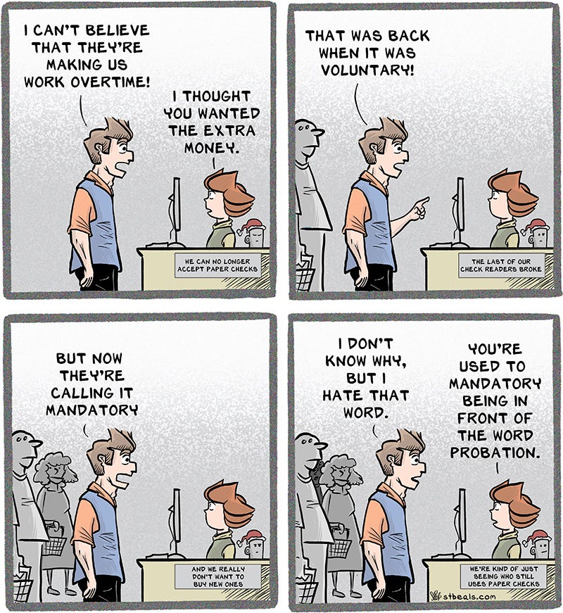 I was working voluntary overtime and then they made it mandatory. It wasn’t so much fun after that. I went from feeling like a hero to just doing what I was told. The word mandatory hasn’t yet been changed into some new, feel-good term, but when it does it will be a great one to make fun of.