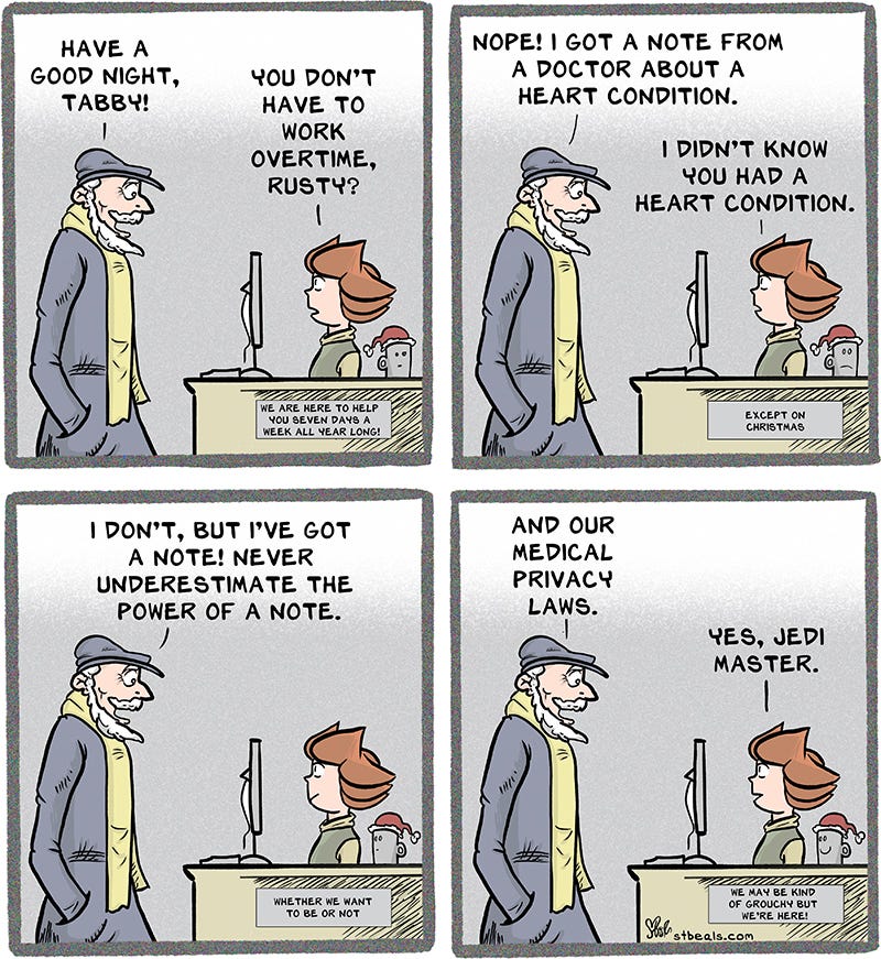 I love privacy laws. All you have to say is “doctor”. After that, it’s none of their business. After privacy laws, my favorite is “reasonable accommodation”. A chair is a reasonable accommodation if it doesn’t change the nature of the job, for instance. The only problem with that one is that many employers aren’t even vaguely familiar with the world reasonable.