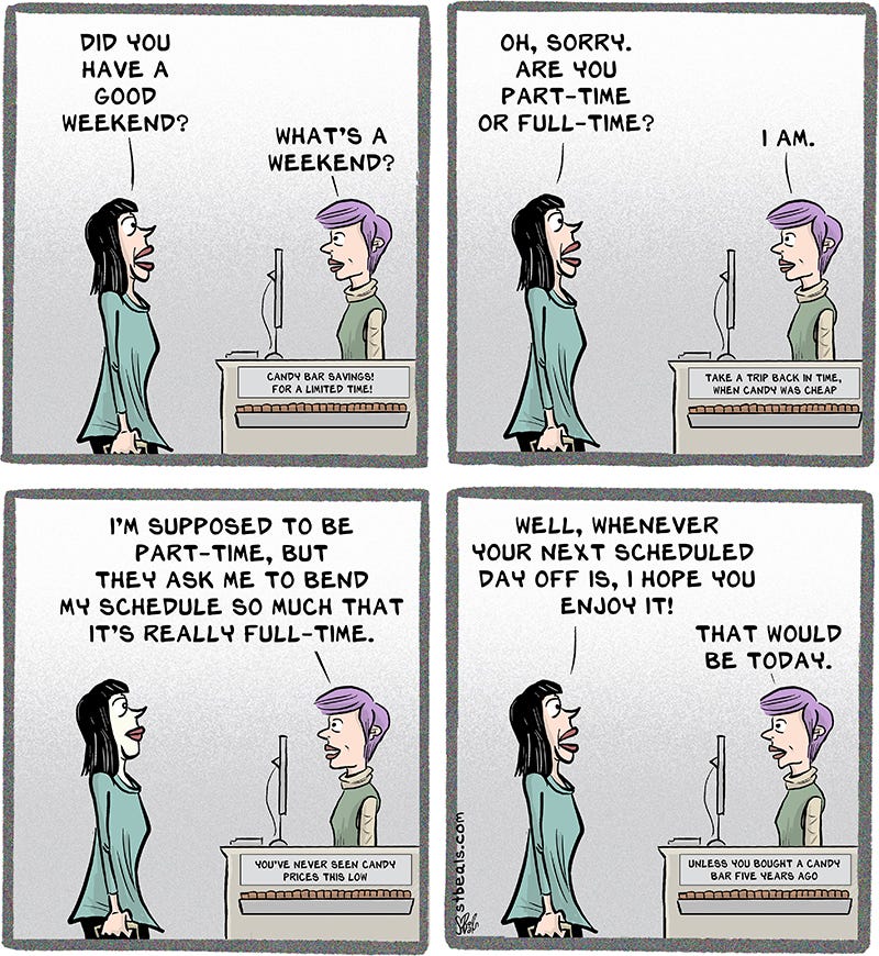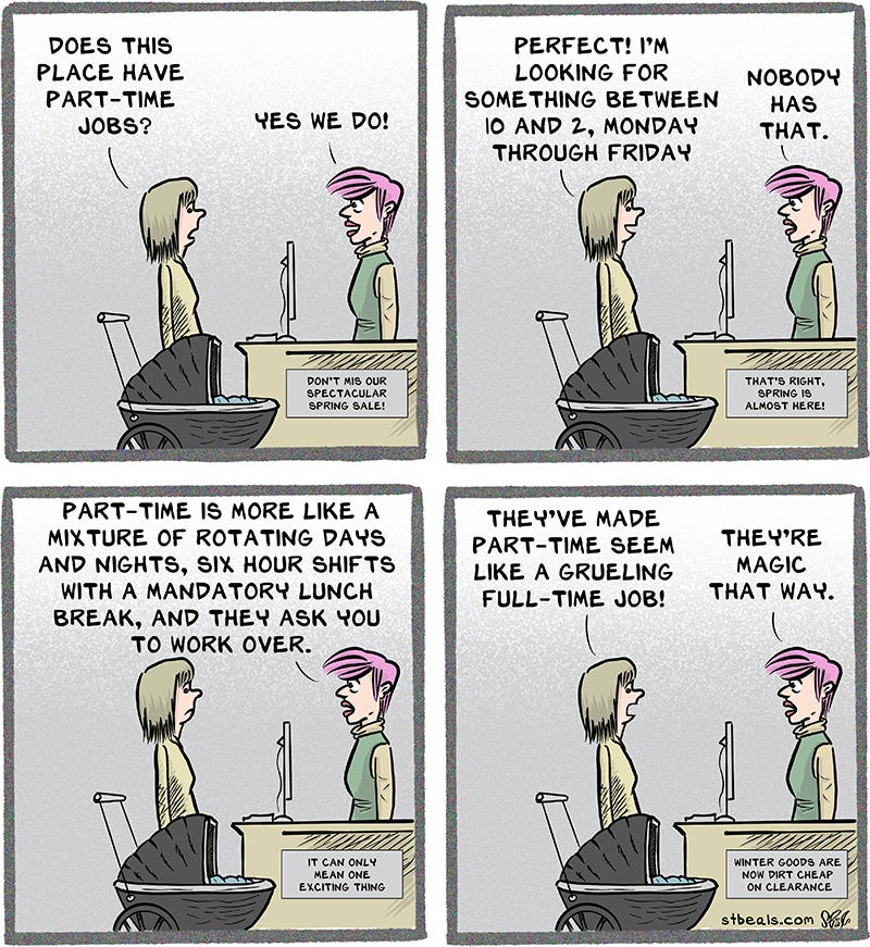 You know who gets offered all of the overtime hours? Part-time workers. Part-time workers are typically hired to work full time hours part of the week. It’s seldom a happy four hours a day, as the description of “part-time” would have you believe. No, a typical business, especially in retail, can stretch those part-time hours out to look like a grueling full-time schedule.