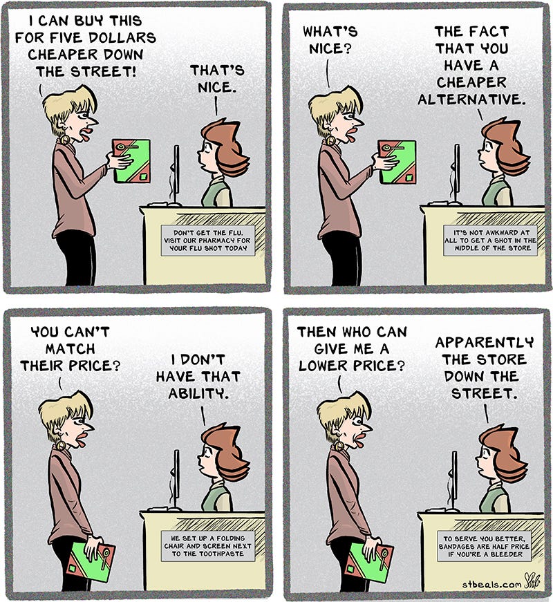 They don’t give the average employee the power to price match because they are afraid cashiers will go crazy and just constantly lower prices. It would ignite some sort of revolution, cause all of the stores to fail, and make the world economy collapse. Well, at least that’s what they act like what would happen.