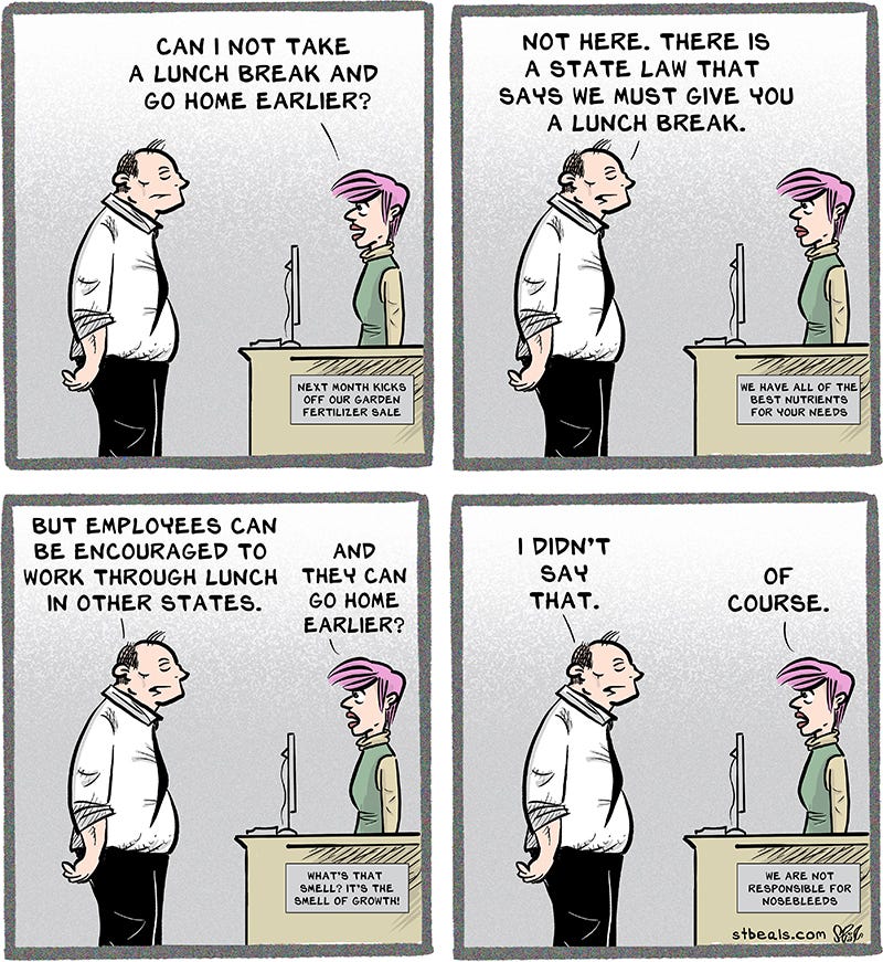 I work in such a state. I worked through my lunch break, but it never meant that I could go home earlier. I just wound up with overtime for the week, which would sometimes confuse and anger management. I would like to publicly apologize to management for the inconvenience. I would like to, but I won’t. I needed the money.