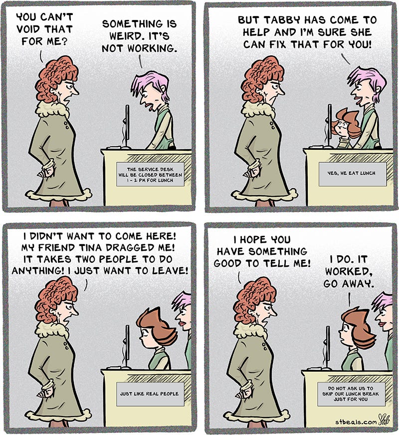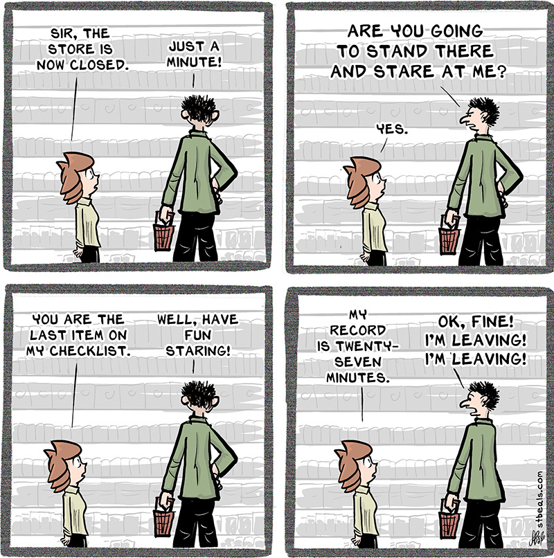This is an update of an old theme about Tabby getting the last customer to leave the store. If you want someone to leave, silently staring at them usually does the trick.
