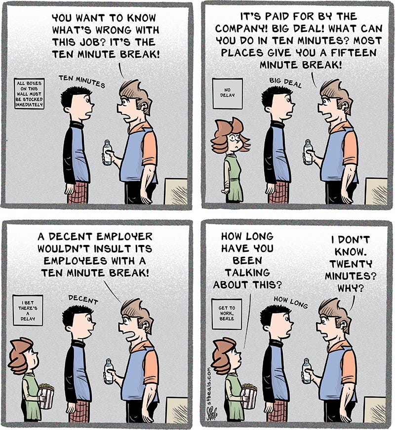 I do think the ten minute break is a worthless insult, but this was inspired from my time at a university library. There was so much time devoted to sitting around and talking about things that it’s almost impossible to parody. Entire work days could be written off as group discussions.