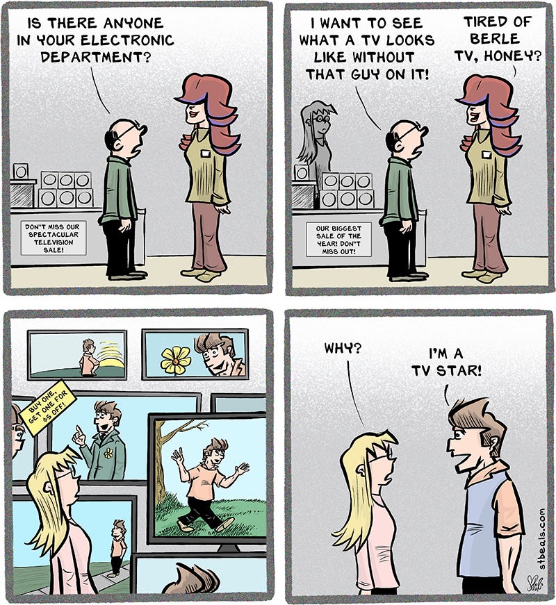 I don’t know why, but I was looking at a bunch of TV displays and imagined Berle on every screen. I was probably tired. This was one purely to amuse my tired brain.