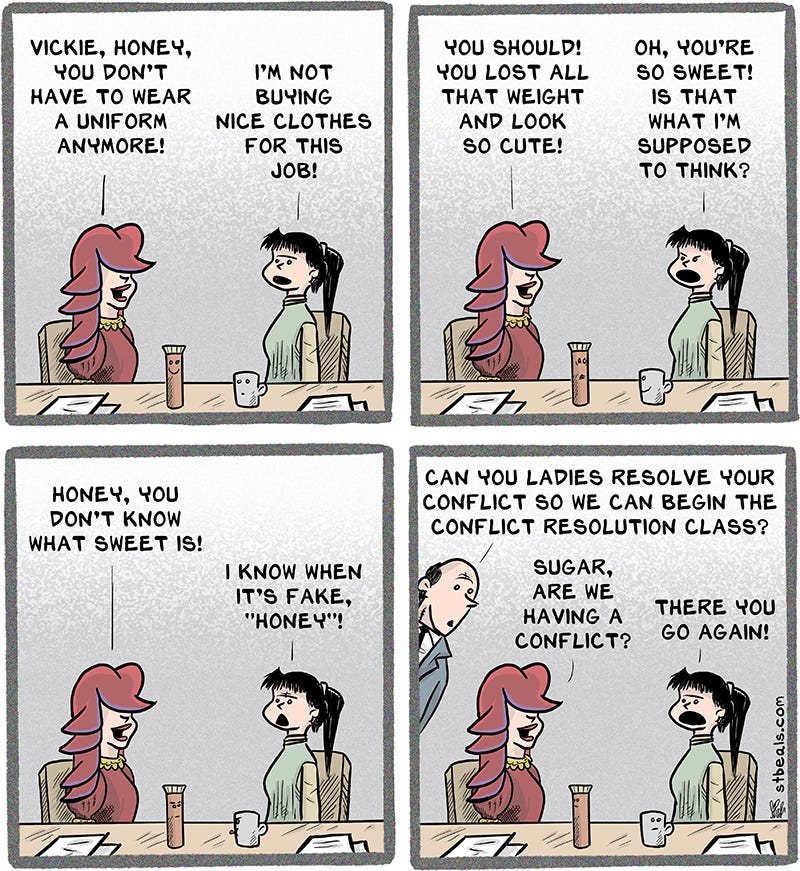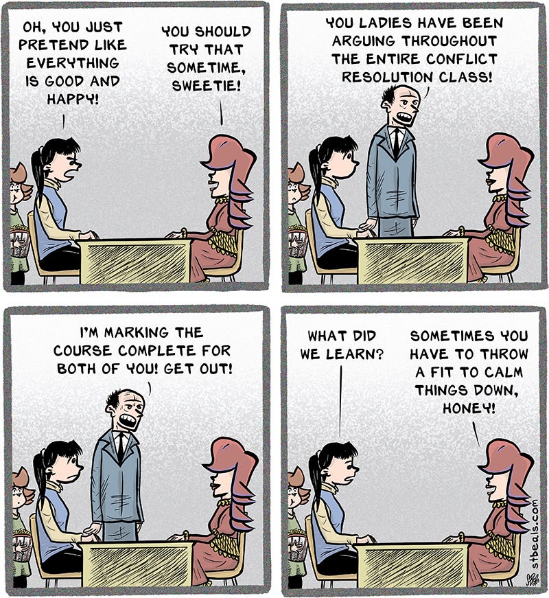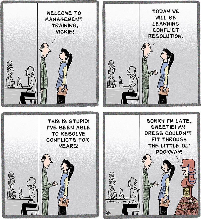 Depending on where you work, Conflict Resolution is a big part of management training. Again, depending on where you work. Some places have more of a “sink or swim” approach to the whole training thing with their managers and there’s little or no training. You can tell which companies do that because they go through managers as quickly as regular employees.