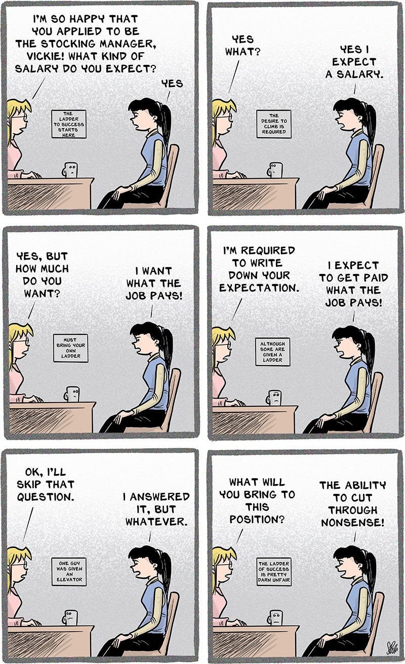 We now switch gears to promotion. Here we have the guessing game that companies like to play when talking about a position. Yes, companies ask what salary you expect even when they advertise the salary for the position. Nobody knows why they ask this. It’s rooted in deep mystery that some say goes back to ancient times when witches ruled the planet. Others say it’s because the company is stupid. Somewhere in between lies the truth.