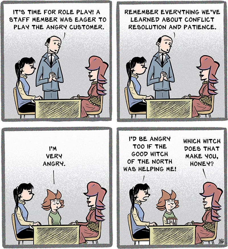 Anybody who enjoys role playing in these work exercises should really just take a theater class. I once adapted a French accent during one of these, and the poor manager opposite me wound up yelling at me to knock it off. That was points deducted for her.
