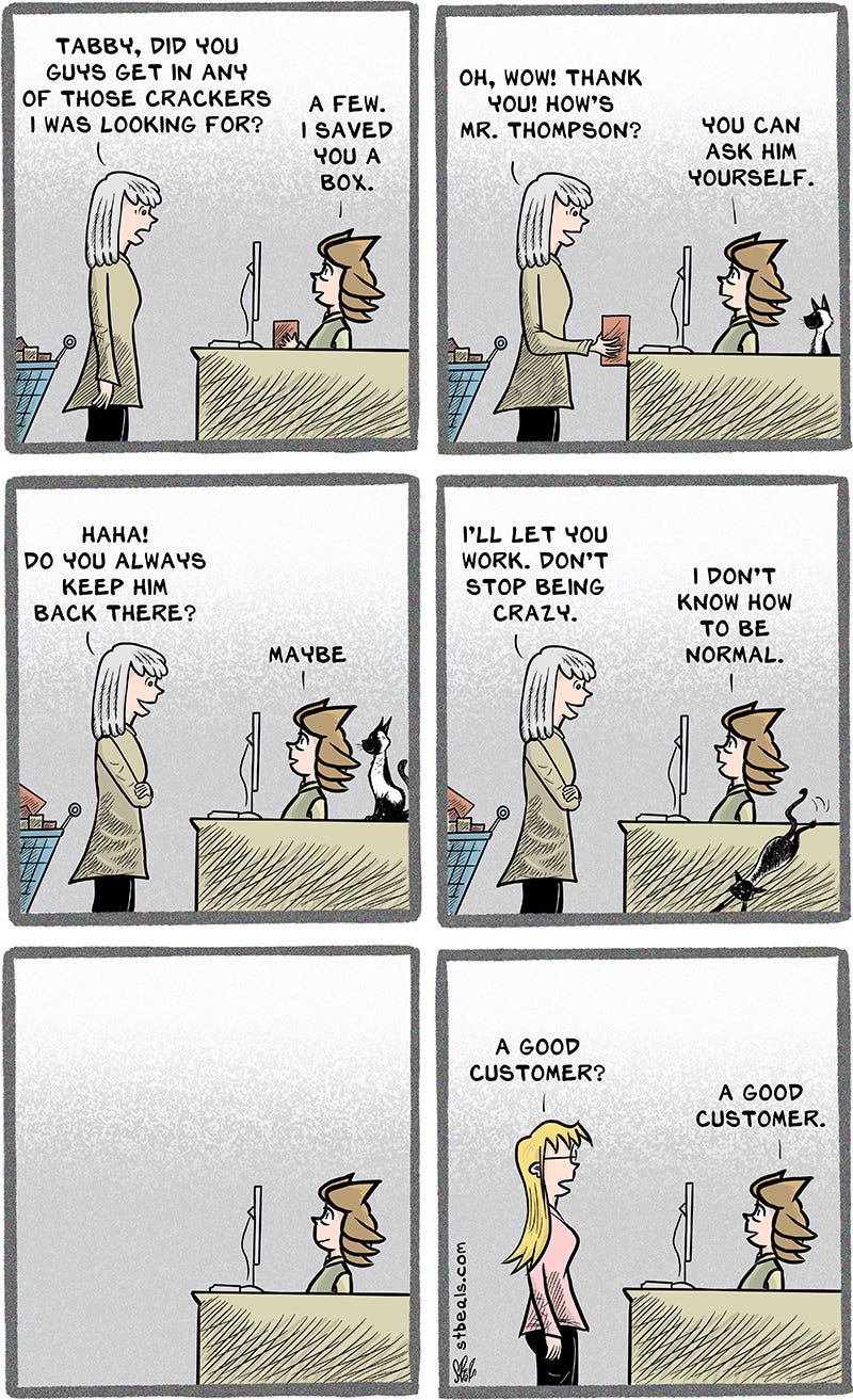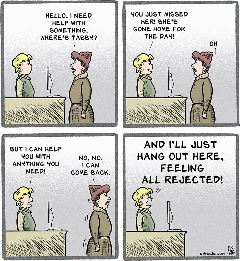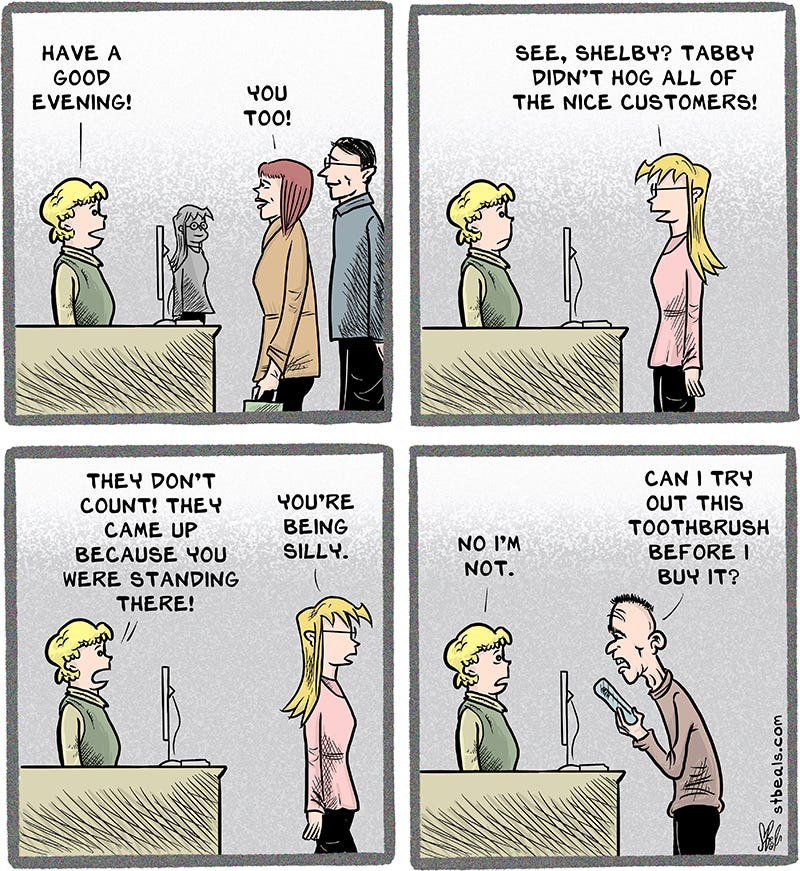 They are two totally different personality types. Whenever you need to speak to a manager, you’ll probably get a Vickie more often than an April Bloom. I could make countless strips just having them talk to one another, but in the end I have to recognize that I’m trying to do more than just entertain myself.