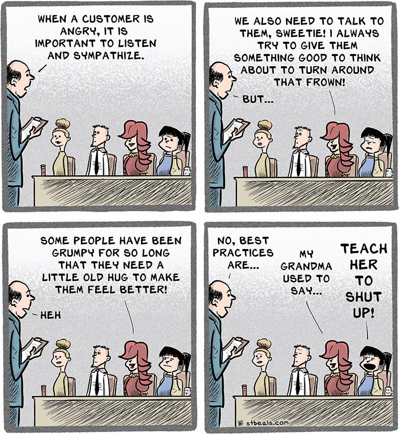 If you make the instructor angry during Conflict Resolution class, you’ve passed. And if you don’t get angry at a customer who wants to make you as angry, you’ve passed the real test. The trick, of course, is to let all of your anger out after the customer finally leaves in the direction of their retreating car. It might cause transmission failure.
