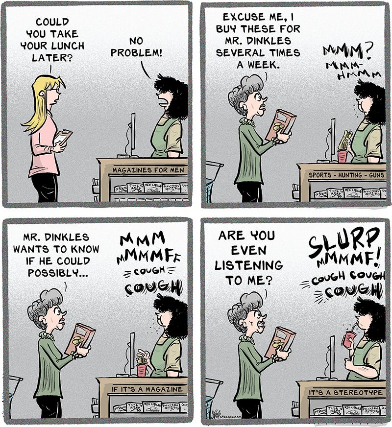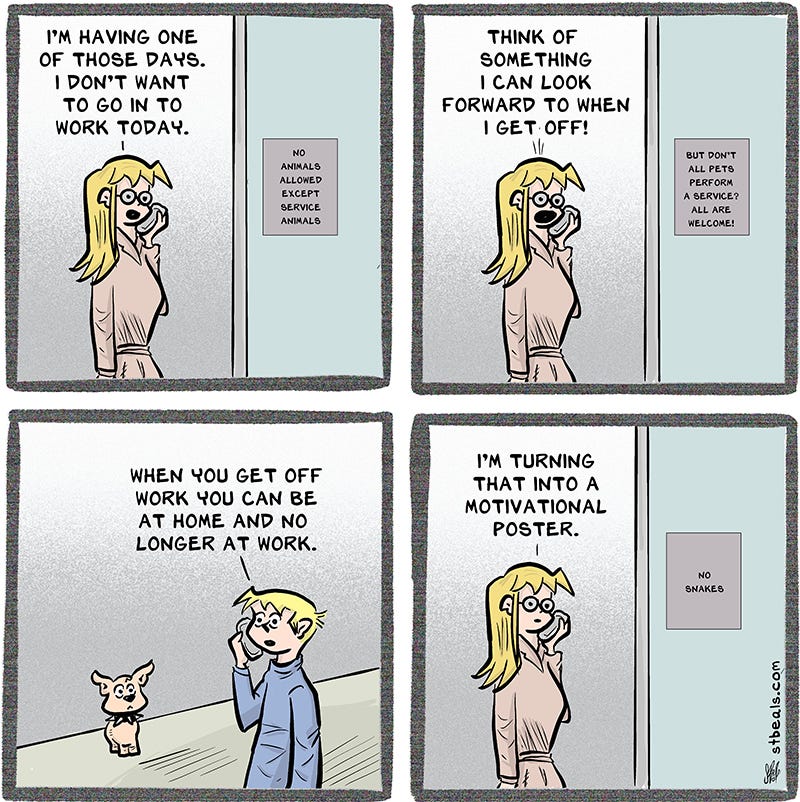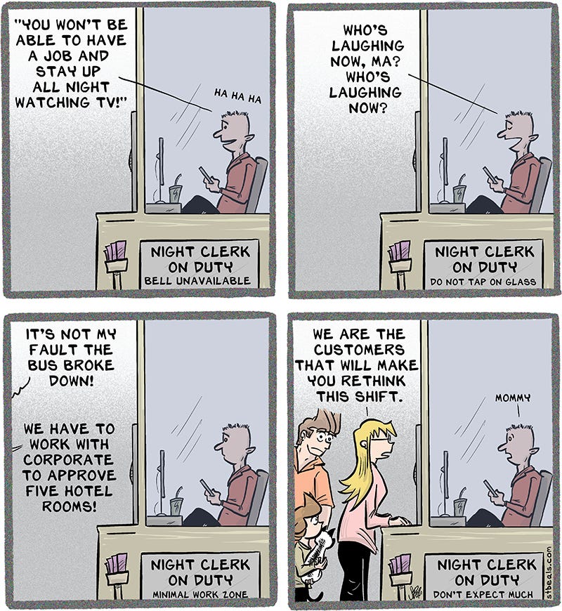 Sometimes I have a sign because I need to establish a setting, like this night clerk, but I still want to say something about the job. Theoretically, being a night clerk would be awesome if you could just sit and read or (more likely) binge TV, but I’m guessing it’s not the idyllic life.