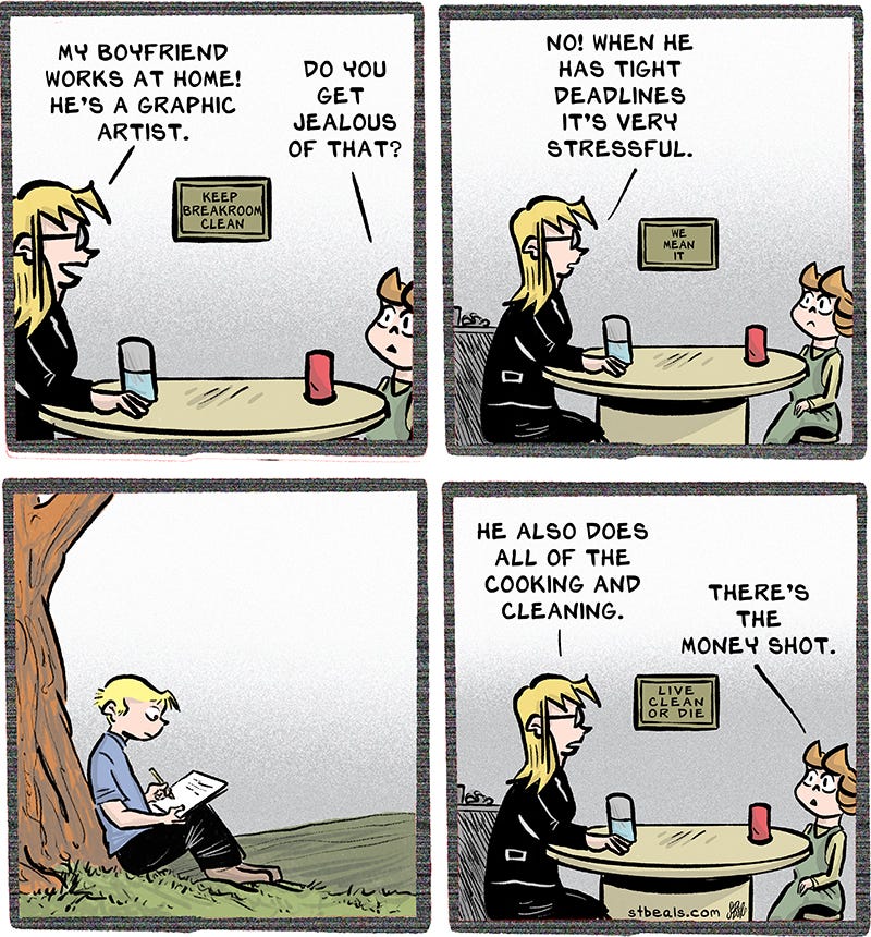 By this point, readers were noticing my signs and enjoying them. In some strips, the signs were better than the comic, which is a little disconcerting because I usually write the signs in about five seconds.