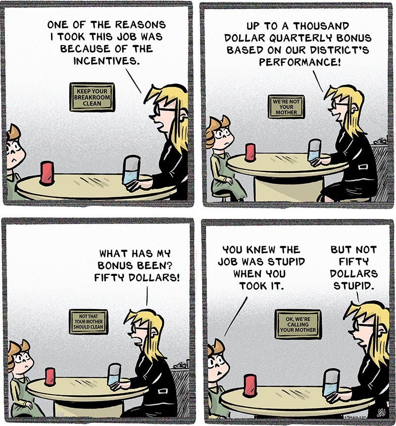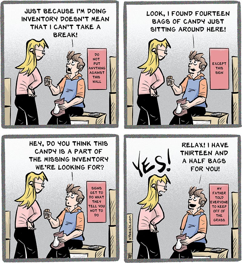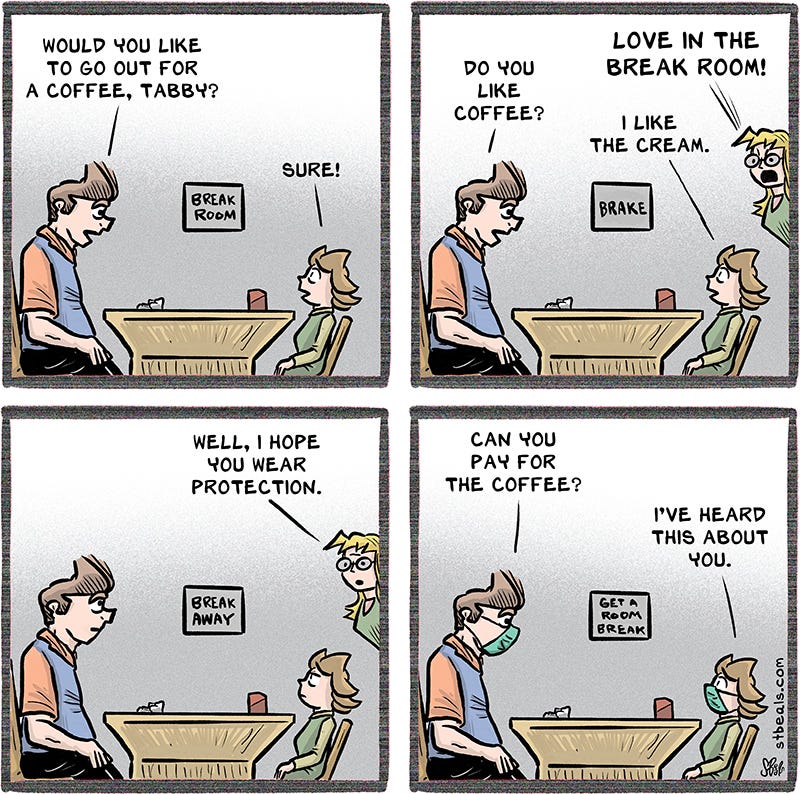 I’ve seen a lot of breakroom signs, so of course I started putting signs in the comic’s breakroom. I have no clear memory of changing the wording on signs. I think I just did it to amuse myself.