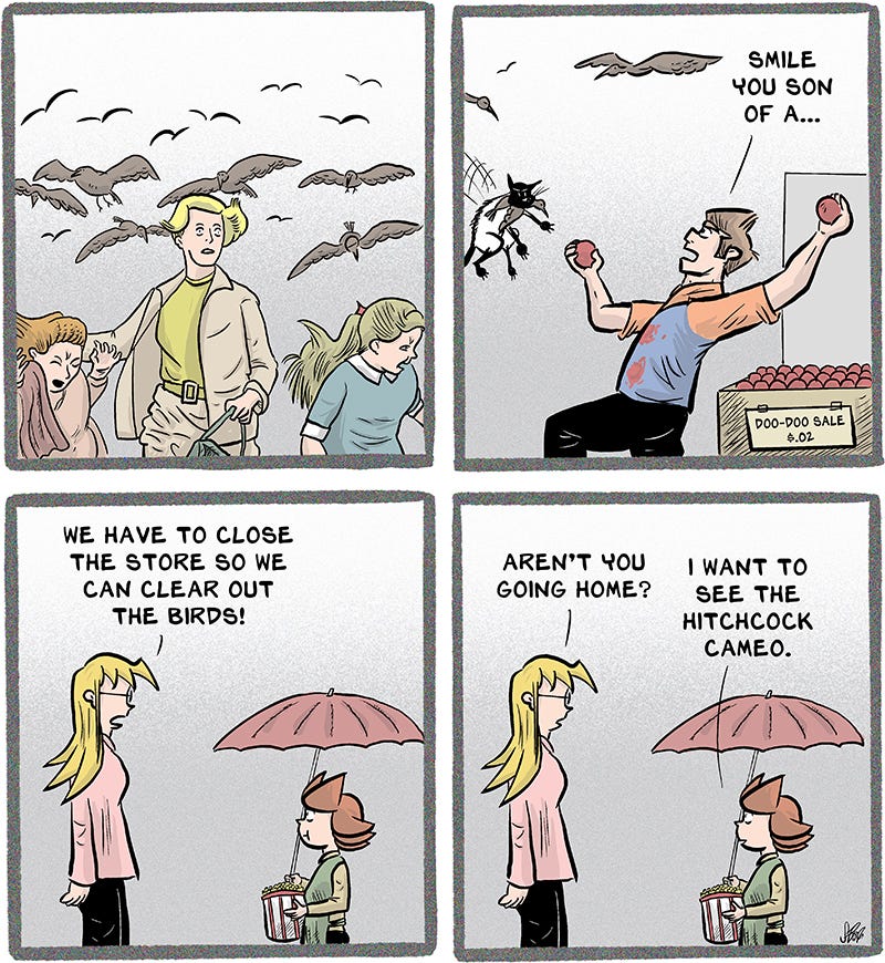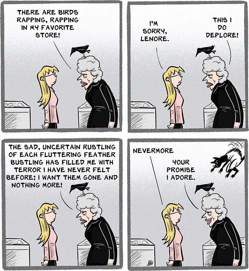 Any excuse to pay homage to The Raven is wonderful. I remember worrying that people who’ve never heard of Edgar Allen Poe would be confused, but it winds up that many comic strip readers are very familiar with Poe. One reader was going to a Poe Festival on the day she read this strip. Amazing.