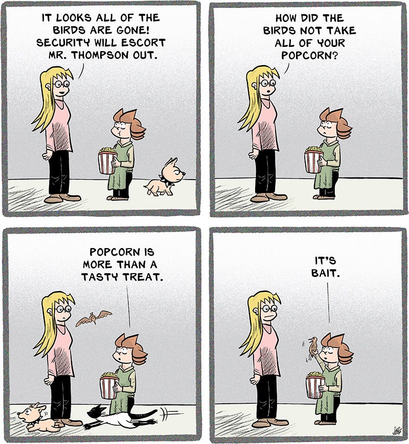 Tabby and the popcorn. Drawing this led me to the conclusion, because I imagined Tabby keeping birds away from her popcorn.