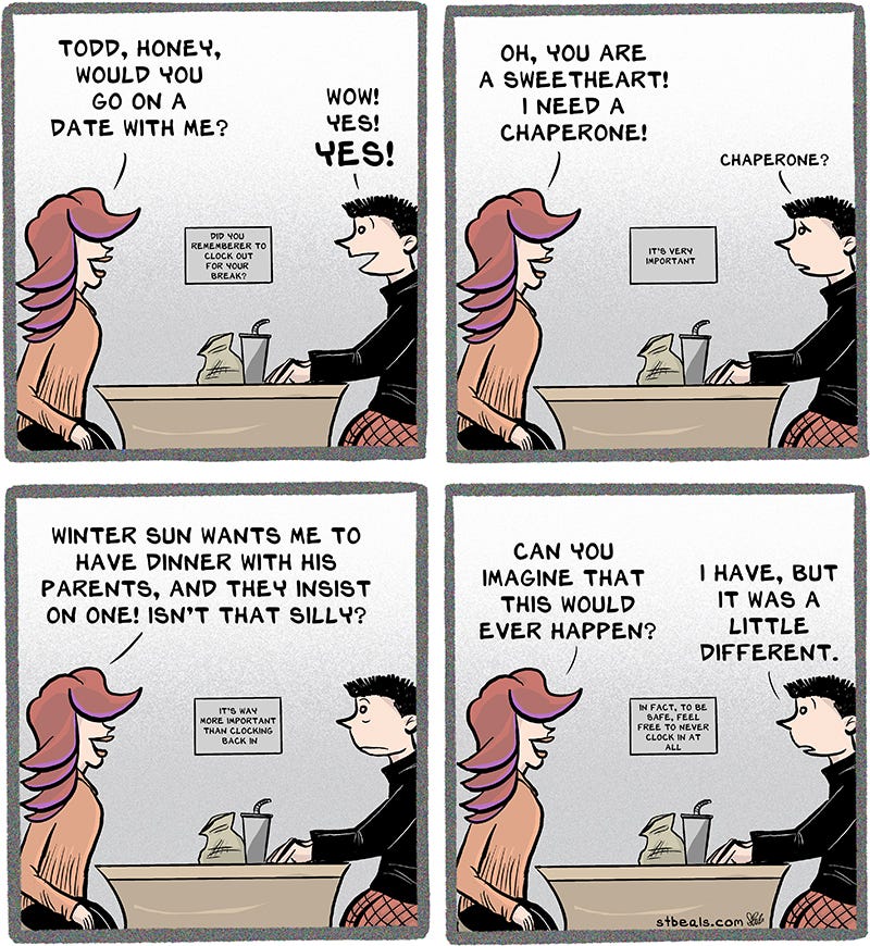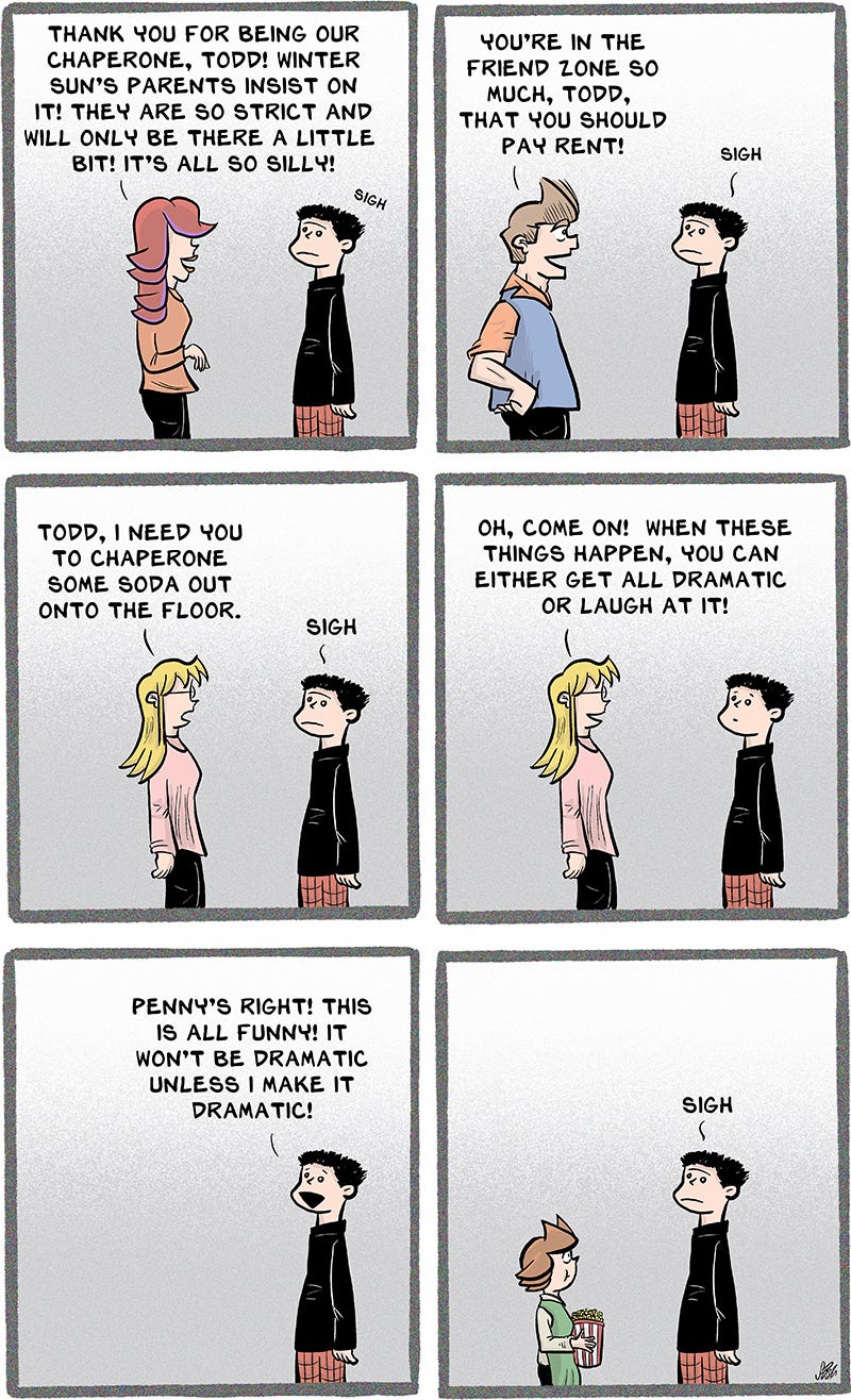 This picks up on Todd’s previously established crush on April Bloom. It’s a hopeless crush, and because of April Bloom’s character we’re not going to go all Charlie Brown here and have her be cruel to him. Instead, we’re focusing on Todd’s kindness to play along.