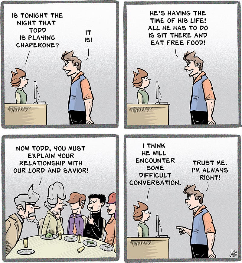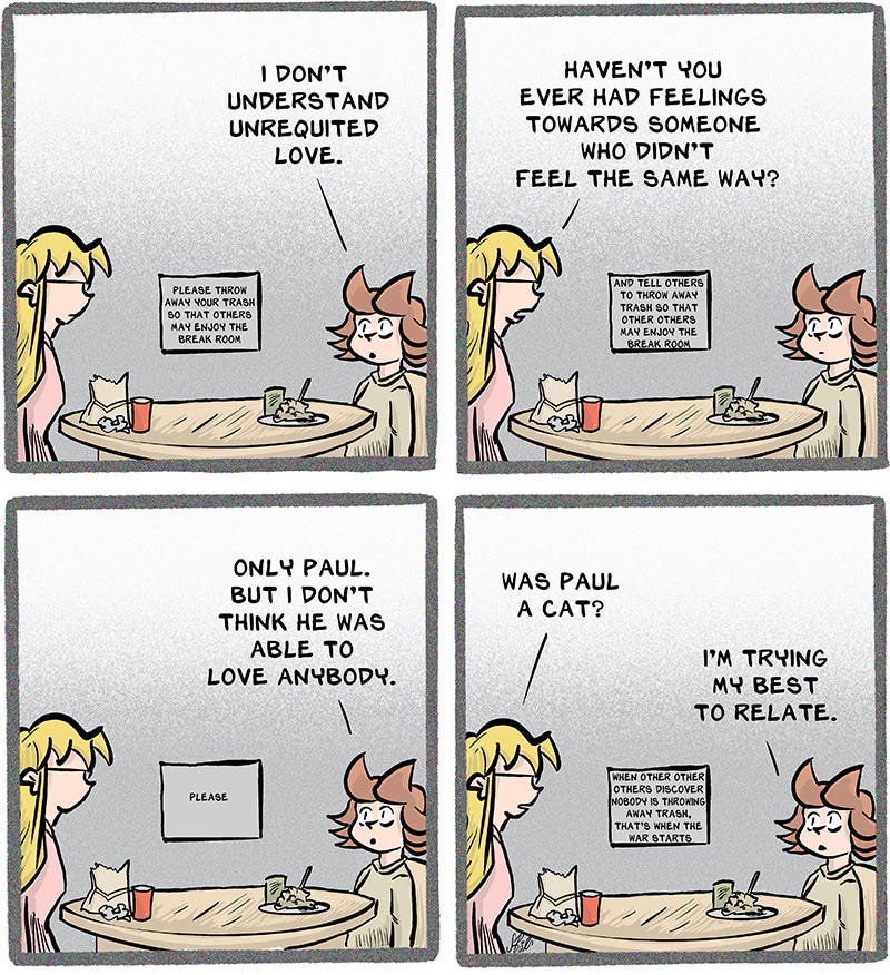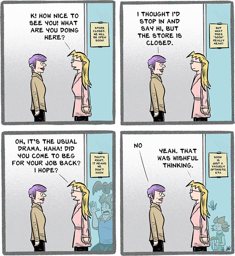 Sometimes I have a scenario or punchline that takes a couple of strips to journey towards. “Penny gets promoted because she fell into a cave” was an idea that took quite a few strips to accomplish and the challenge was to make that interesting. You can’t spend two weeks in a cave or people will lose interest. In fact, “you can’t spend two weeks in a cave” is my advise to all aspiring writers.