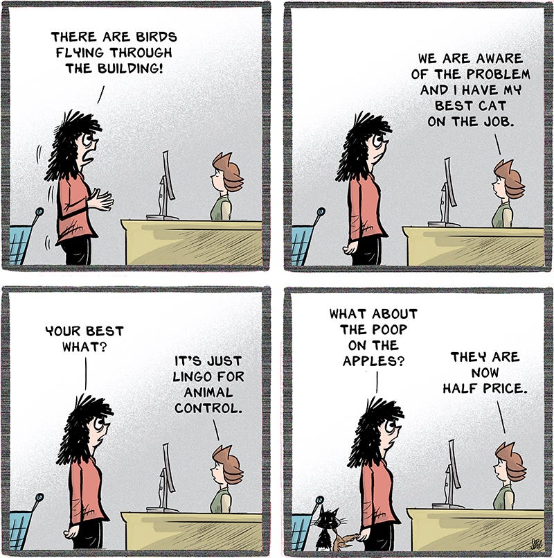 Of course. Her cat-like reflexes. No birds were harmed in the production of this strip.