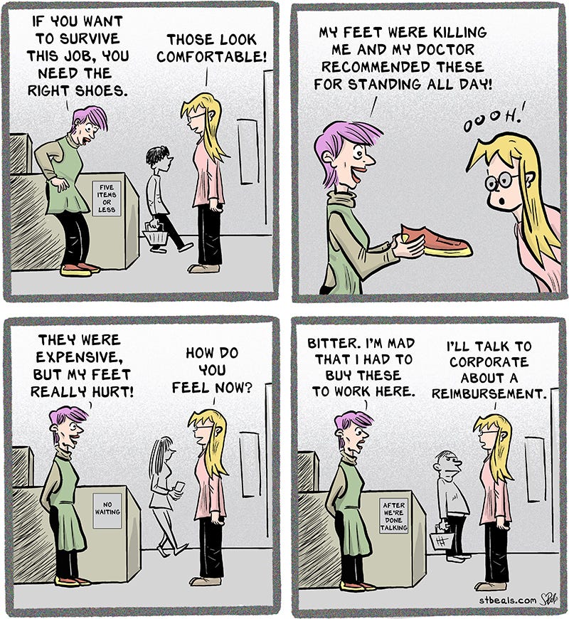 I got to hear from several people whose companies pay for their shoes and I handed out several congratulations. I only had that for the two days I was technically employed as a package handler for FedEx. I got to keep the shoes and wore them during my time as a graphic artist for Gannett newspapers. They made two of my toes on my left foot swell up so badly I had to go to the doctor. Considering that I was only sitting down all day as a graphic artist, I’m glad I never wore them as a package handler.