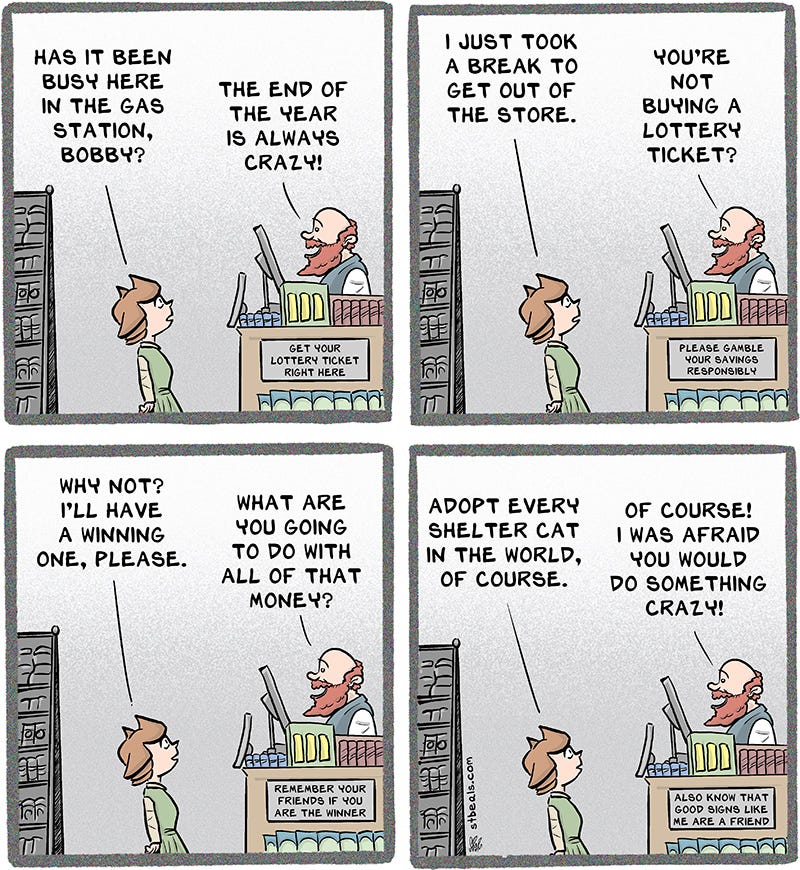 Tabby is the one character who I imagine giving a lot to charity if she were to win the lottery. I envision an animal shelter in a perfect replica of the Sphinx. A Sphinx with Tabby’s likeness as a head would be even better.
