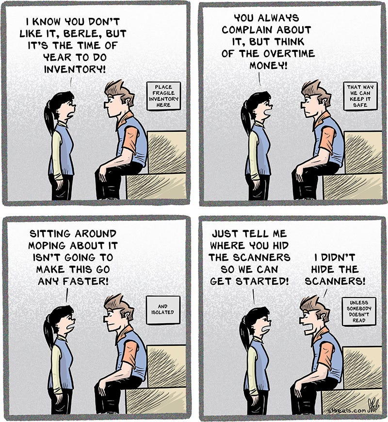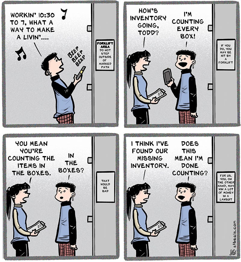 I totally relate to your strips about inventory. I worked for a company that used to do inventory once a year by hand. That ment hours of tracking down every single item like we were out tracking fugitives and bringing them to justice. Inventory was pretty much, more or less, accurate then. Then they got the bright idea to only keep inventory by using the tags on the boxes that supposedly accurately described the contents and an electronic system that tracked the location. Soon nobody knew where anything was at and had to track it down like they were seeking a fugitive to bring it to justice. Perfect.