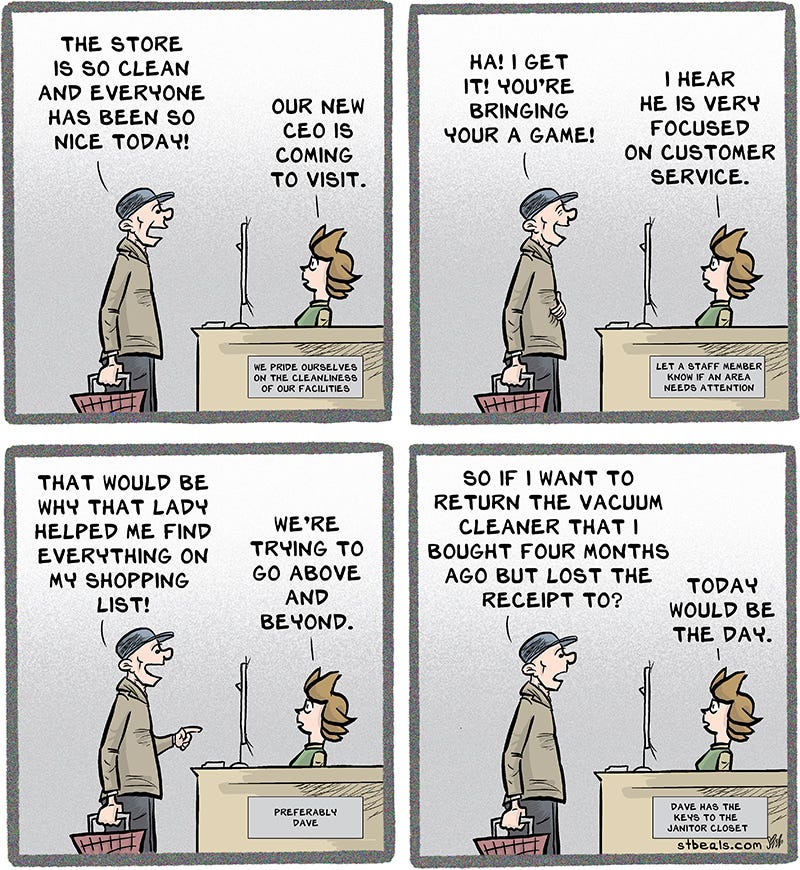 We really need a crack telephone team to inform the customers when higher ups are coming to visit. We’d all get the best customer service we’ve ever had.